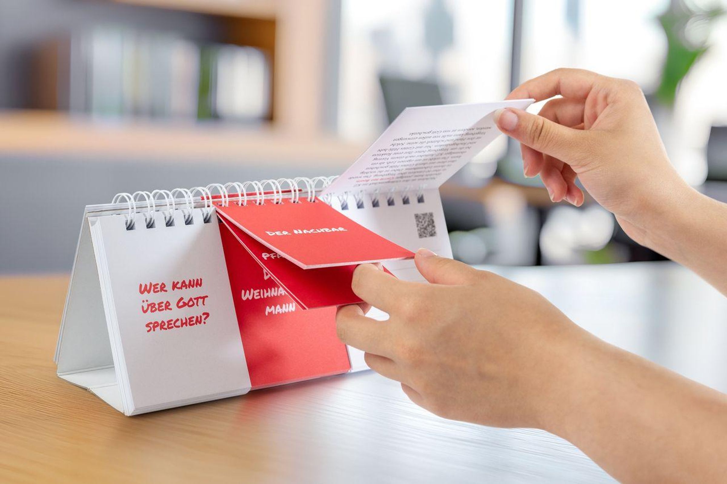 Das Besondere: Statt einer festgelegten Abfolge gibt es drei klappbare Elemente pro Woche. Die insgesamt 162 beidseitig bedruckten Karten können abwechslungsreich ganz nach Geschmack und Stimmung kombiniert werden. Das ermöglicht z. B. den persönlichen Bibelvers der Woche oder individuelle Kombinationen aus Frage- und Aussage-Karte, die mal lustig sind und mal zum Nachdenken anregen.