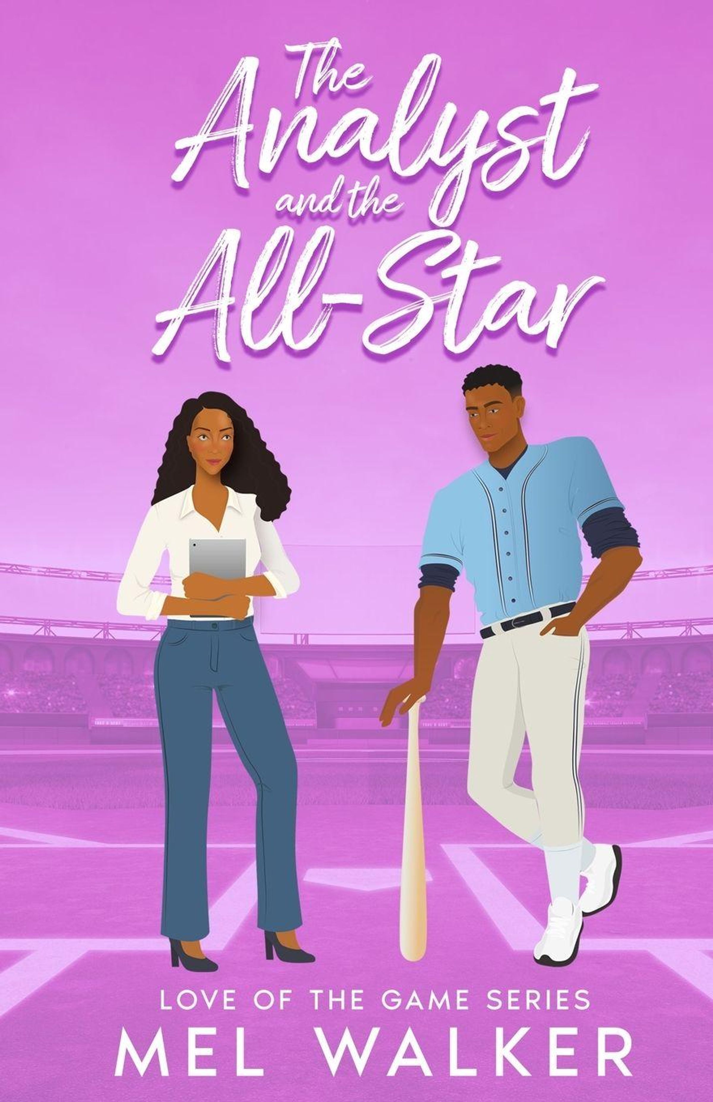 "The Analyst and the All-Star" oben. Unten "Love of the Game Series" und "Mel Walker". Illustration: Frau mit Klemmbrett, Mann mit Baseballschläger., Buch