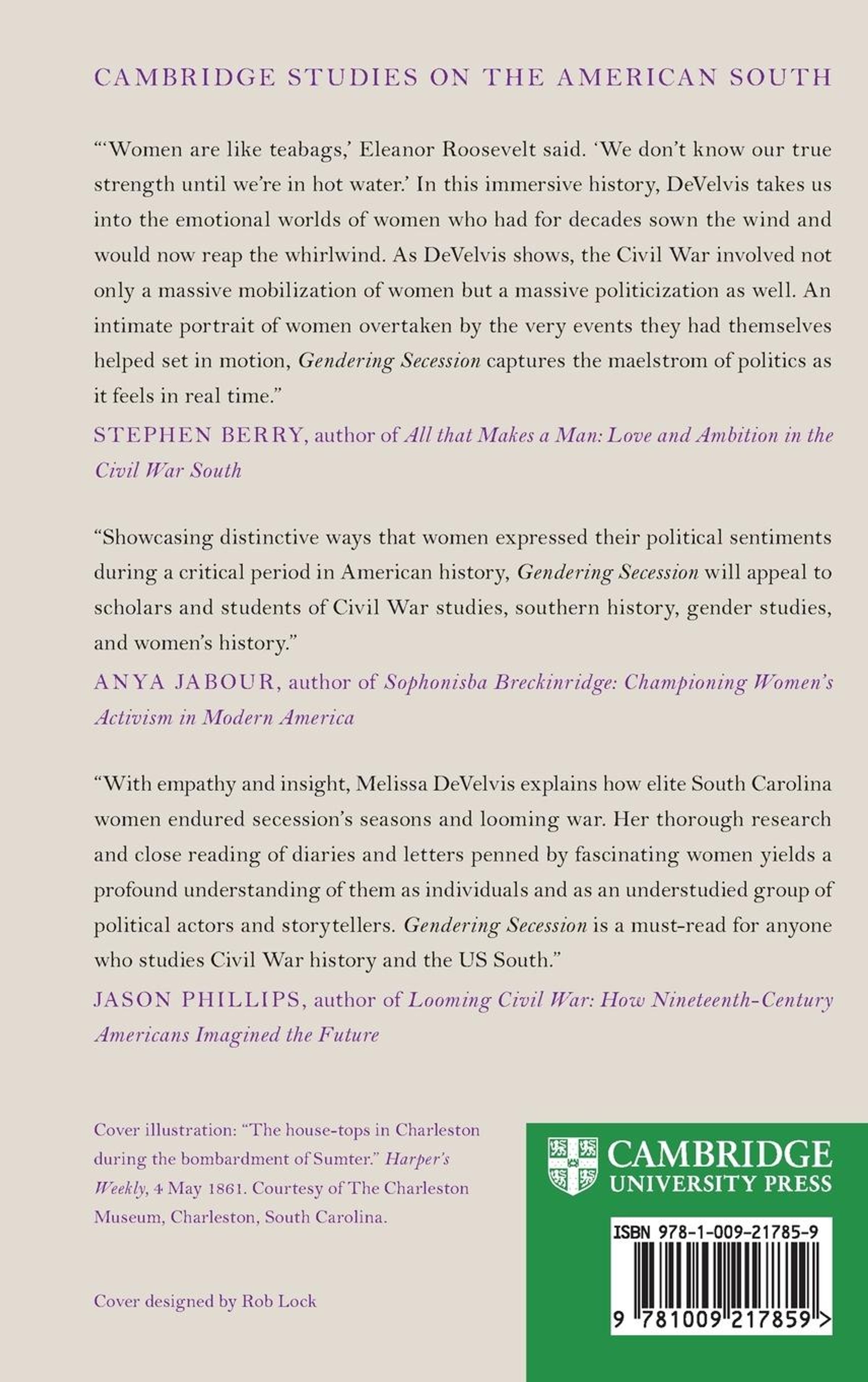 Gendering Secession explores the lives and politics of South Carolina's elite white women from 1859 to 1861. The political drama that unfolded during the secession crisis of 1860 has long captured our attention, but scant regard has been paid to the secessionist women themselves. These women were astute political observers and analysts who filtered their "improper" political ideas through avenues gendered as feminine and therefore socially acceptable. In recreating the rhythms of the year 1860, Melissa DeVelvis spotlights the moments when women realized that national events were too overwhelming to dismiss. Women processed these changes through religious metaphor and prophecy, comparisons to history and the American Revolution, and language borrowed from popular novels. Drawing from emotions history, literary analysis, and even handwriting analysis, DeVelvis reveals how these fiercely patriotic South Carolinian women responded to threats of disunion with fears and misgivings that men would or could not express.