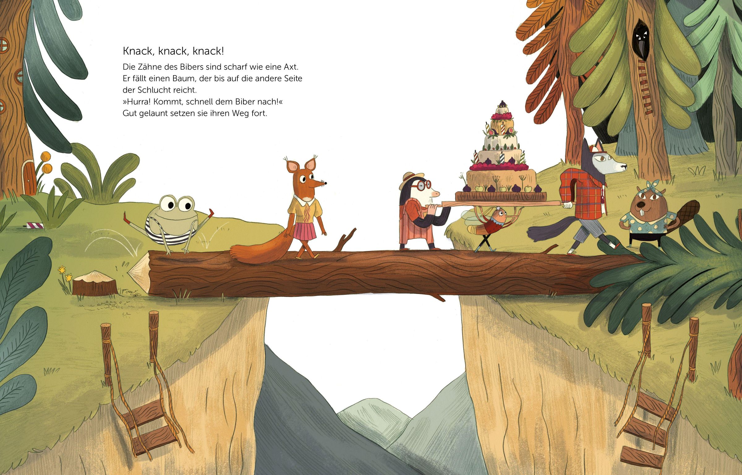 Der Hase hat zum Geburtstagsfest eingeladen und alle Freunde machen sich fröhlich auf den Weg zu seinem Bau.