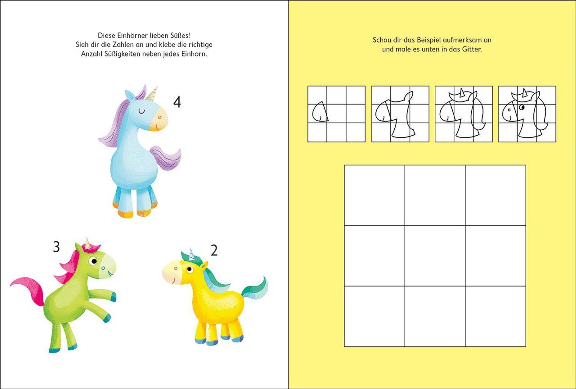 Stickern, Malen, Rätseln Kannst du das Einhorn in bunten Farben ausmalen? Mit welchen Stickern soll die Torte dekoriert werden? Und wer hat vom Cupcake genascht?