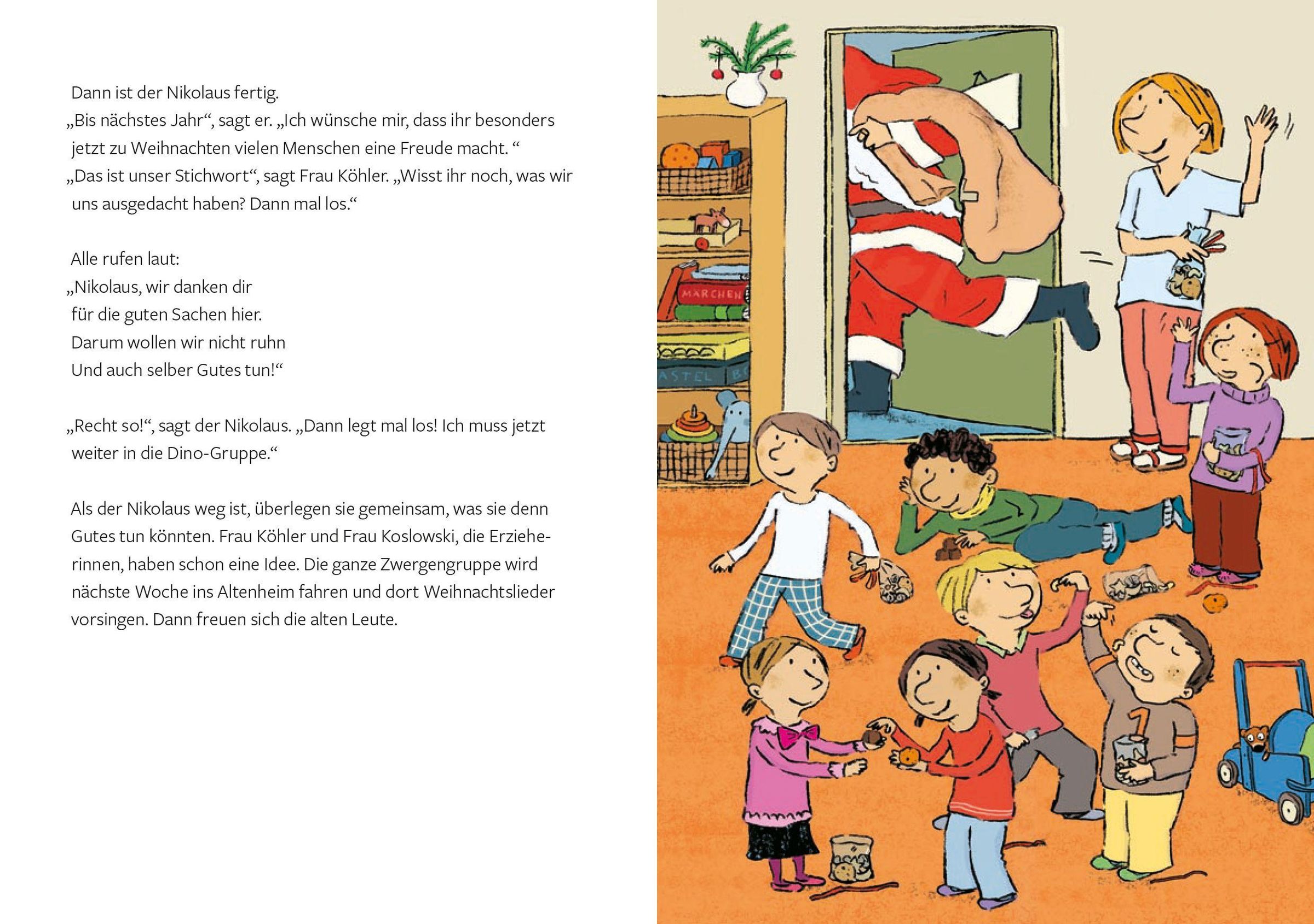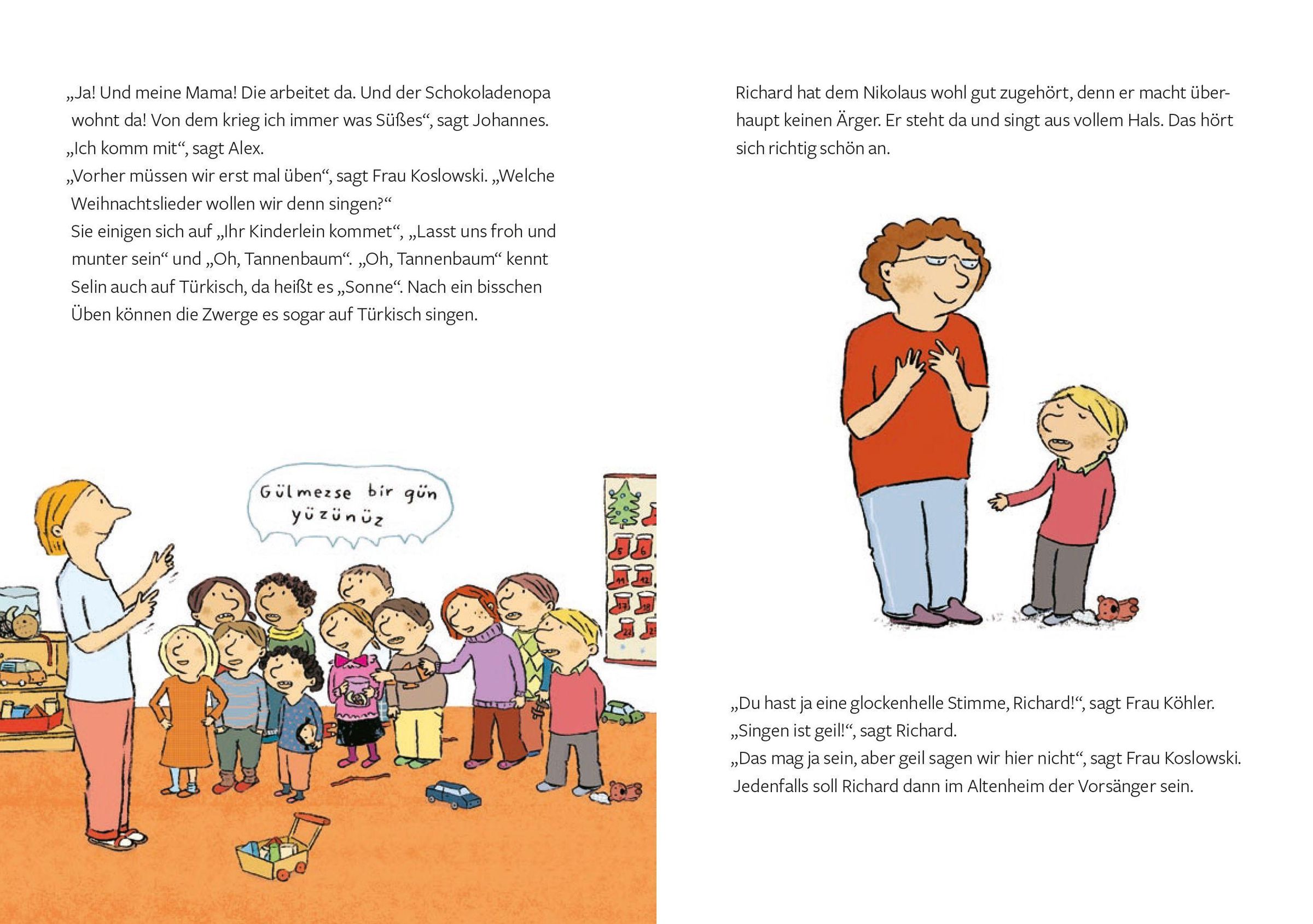 Das hat der Nikolaus gesagt. Die Erzieherinnen haben auch schon eine Idee: Sie gehen alle zusammen ins Altenheim und singen Weihnachtslieder vor. Johannes, dessen Mama im Heim arbeitet, kennt sich dort schon ein bisschen aus. Er weiß zum Beispiel, wo der Schokoladenopa wohnt. Klar, dass Alex den auch gerne treffen will ...