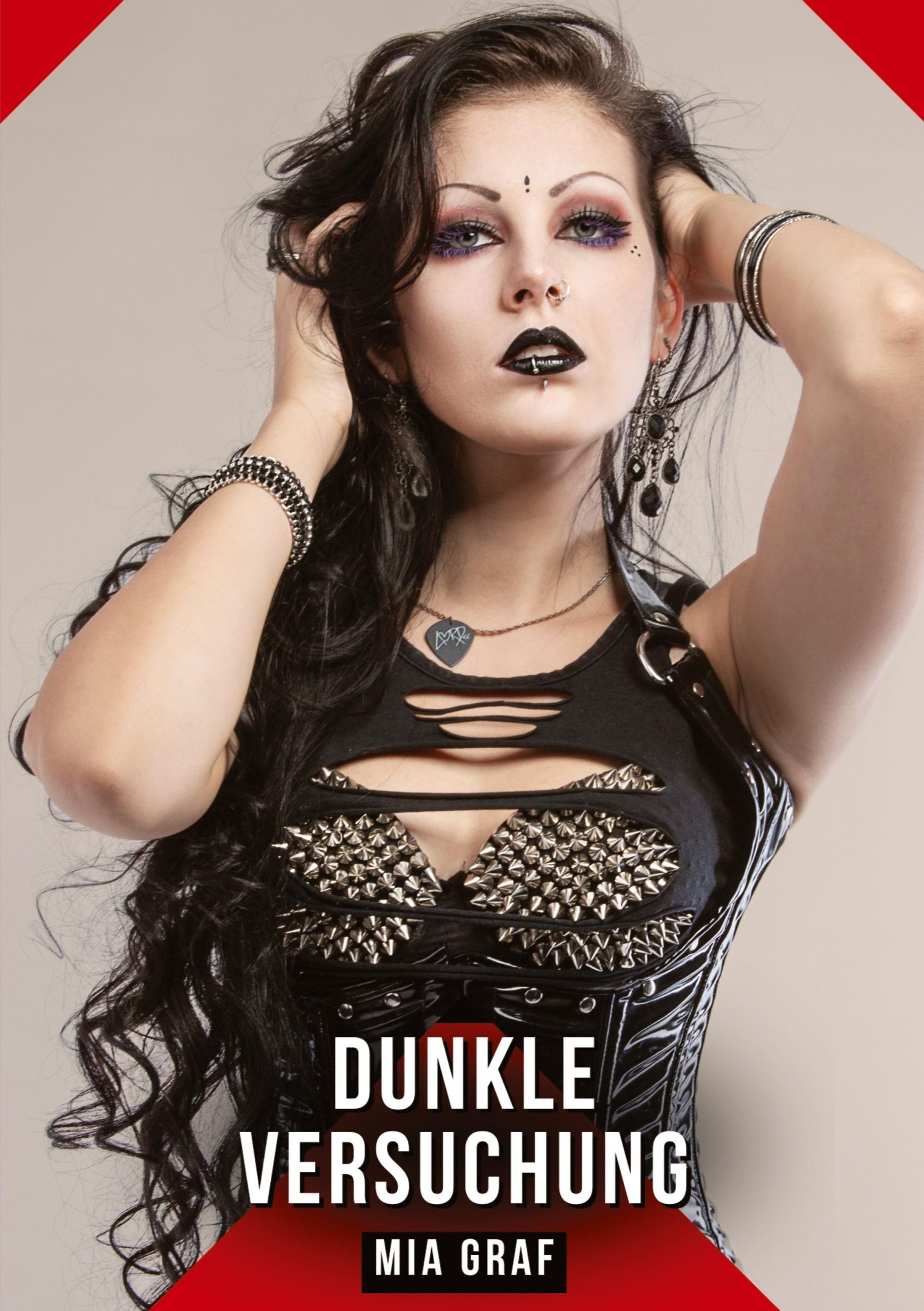 "Dunkle Versuchung" und "Mia Graf" stehen unten. Eine Frau mit dunklem Makeup und gepierctem Lippen in schwarzem Outfit., Buch