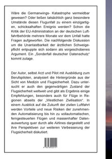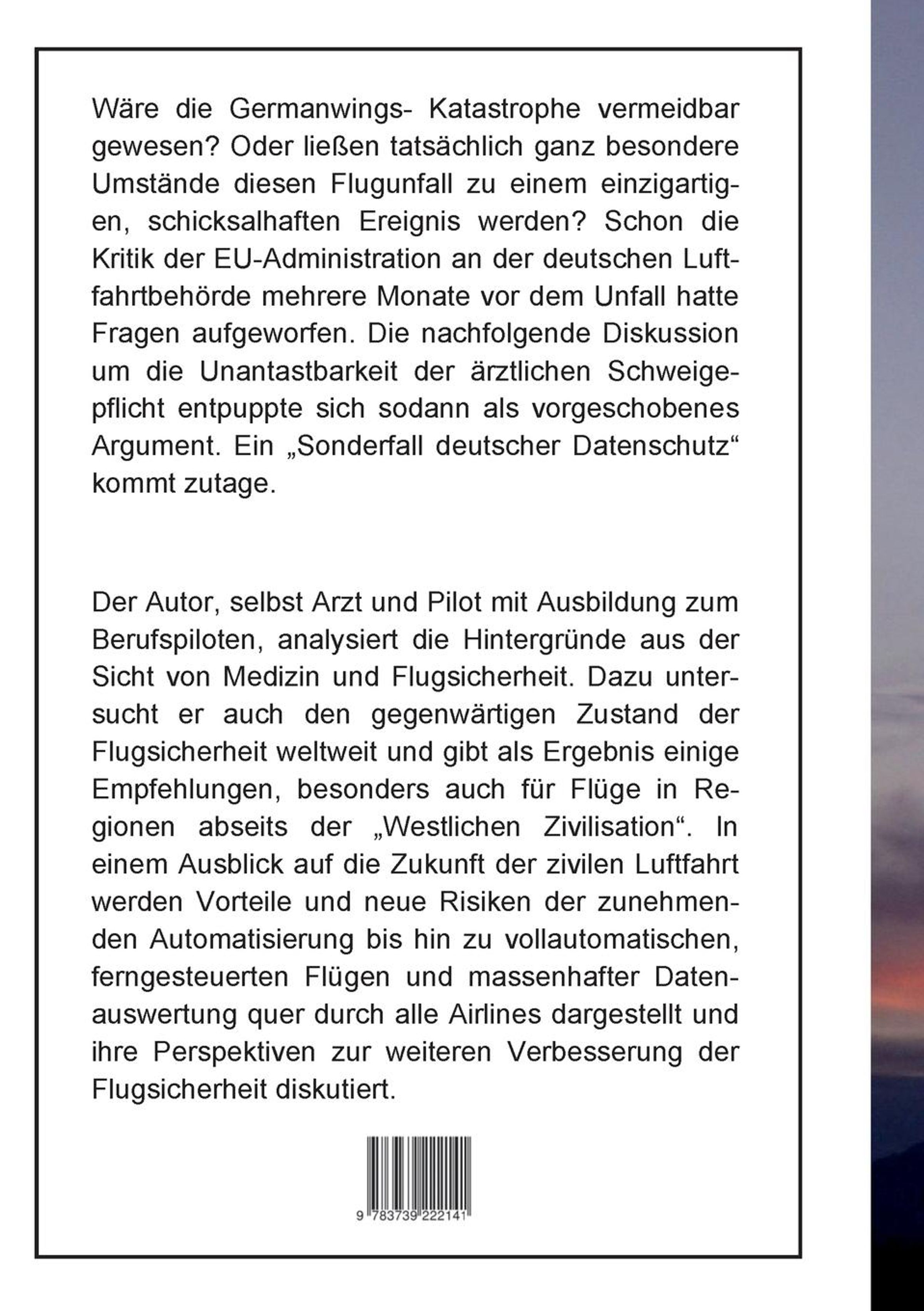 Achtung: Von diesem Buch gibt es eine Neuauflage, erschienen im November 2016, Titel: "Fliegen ist sicher, aber ..., Die Zukunft der Flugsicherheit", ISBN-10: 3741283282. Wäre die Germanwings-Katastrophe vermeidbar gewesen? Oder ließen tatsächlich ganz besondere Umstände diesen Flugunfall zu einem einzigartigen, schicksalhaften Ereignis werden? Schon die Kritik der EU-Administration an der deutschen Luftfahrtbehörde, mehrere Monate vor dem Unfall, hatte Fragen aufgeworfen. Die nachfolgende Diskussion um die Unantastbarkeit der ärztlichen Schweigepflicht entpuppte sich als vorgeschobene Erklärung. Ein Sonderfall deutscher Datenschutz kommt zutage. Flugmediziner tragen eine große Verantwortung. Sie entscheiden, wer als Pilot fliegen darf und wer nicht. Bei den Überlegungen rund um die Germanwings-Katastrophe fällt auf, dass es der rechtliche Rahmen für diese isolierte Entscheidungsposition der Flugmediziner ist, der zum Sicherheitsrisiko werden kann: ein Fehler in der Flugmedizin, oder die Täuschung von Fliegerarzt und Luftfahrtamt auf einem rechtlich möglichen Schleichweg, kann dadurch die gesamte technische Flugsicherheit nutzlos machen. Viele Flugmediziner fühlen sich mittlerweile in ihrer exponierten Lage gar nicht mehr wohl; im Gegenteil, manche sehen sich mit einem Verantwortungsumfang dorthin gesetzt, dem sie teilweise schon aus Prinzip gar nicht gerecht werden können. Aber welche Veränderungen kann man in dieser Klemme zwischen Schweigepflicht und Auftrag zum Schutz der Öffentlichkeit verlangen? Der Autor sammelt dazu Meinungen und Vorschläge - und Gesetzeslücken - die es zu schließen gilt.