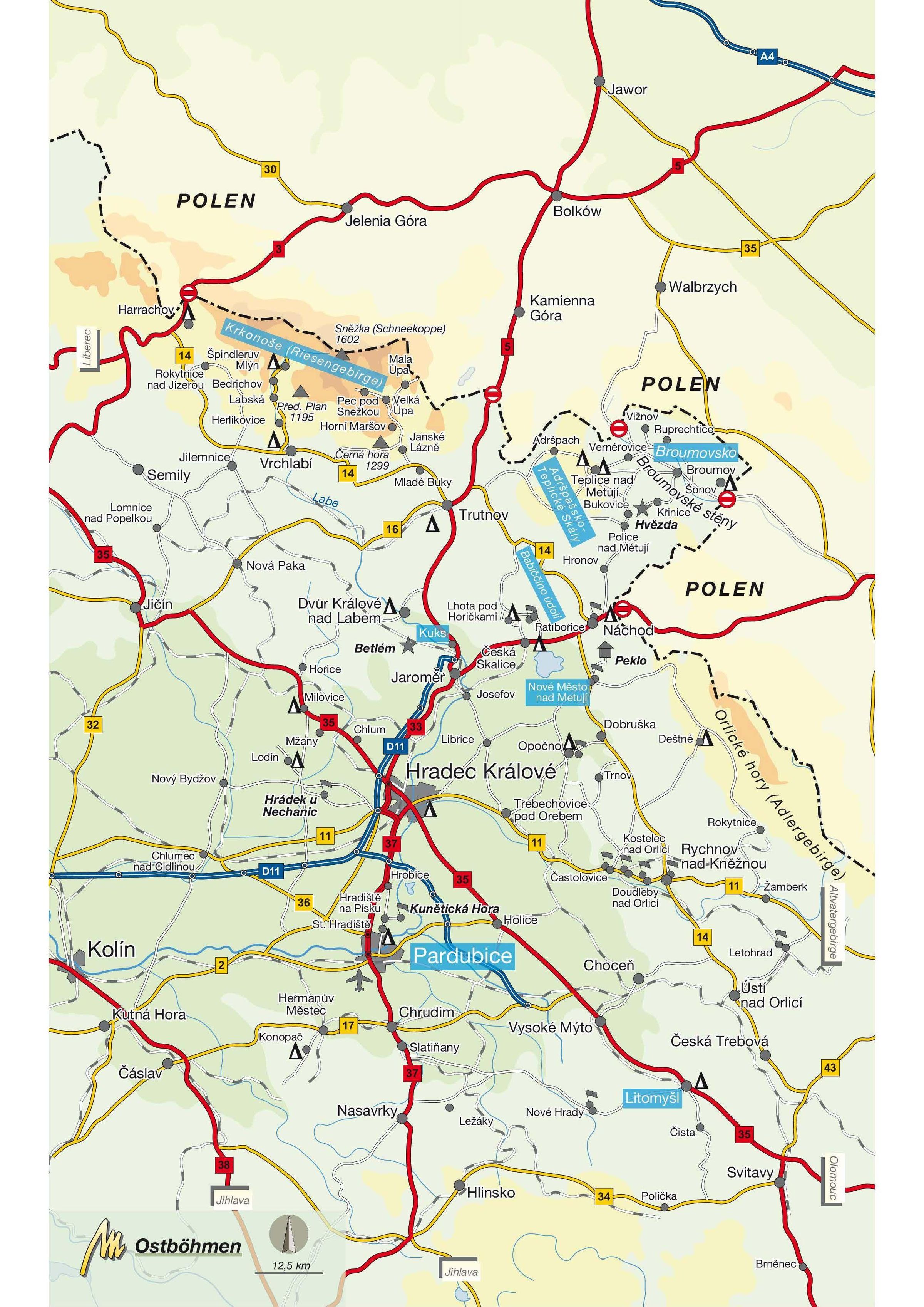 Das Riesengebirge bietet Wander- und Wintersporterlebnisse. Die Adersbach-Weckelsdorfer Felsen sind ein Paradies für Naturfreunde. In Nordböhmen locken Böhmische Schweiz und Böhmisches Paradies.