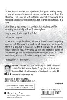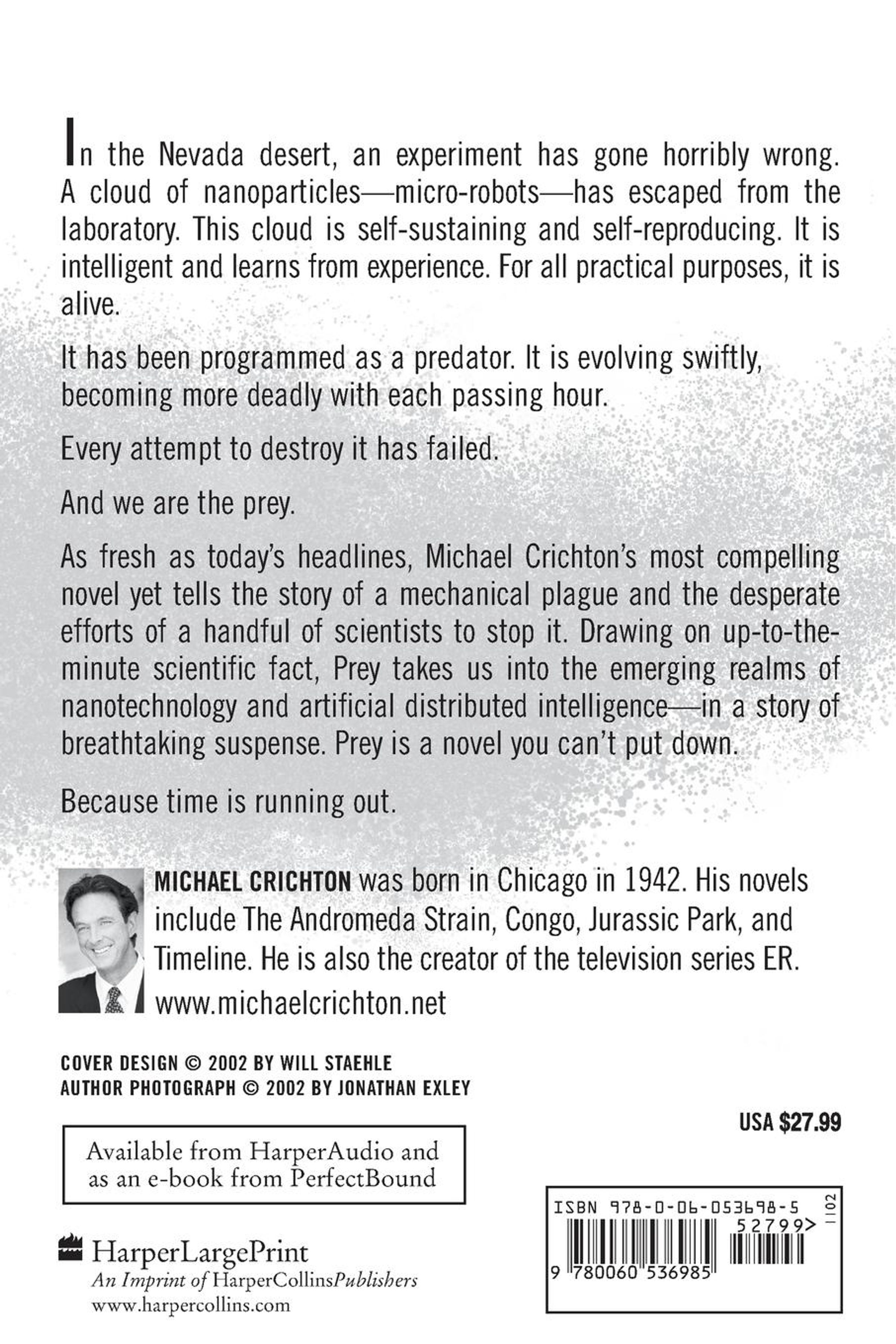 In the Nevada desert, an experiment has gone horribly wrong. A cloud of nanoparticles -- micro-robots -- has escaped from the laboratory. This cloud is self-sustaining and self -reproducing. It Is intelligent and learns from experience. For all practical purposes, it is alive. It has been programmed as a predator. It is evolving swiftly, becoming more deadly with each passing hour. Every attempt to destroy it has failed. And we are the prey. As fresh as today's headlines, Michael Crichton's most compelling novel yet tells the story of a mechanical plague and the desperate efforts of a handful of scientists to stop it. Drawing on up-to-the-minute scientific fact, Prey takes us into the emerging realms of nanotechnology and artificial distributed intelligence -- in a story of breathtaking suspense. Prey is a novel you can't put down. Because time is running out.