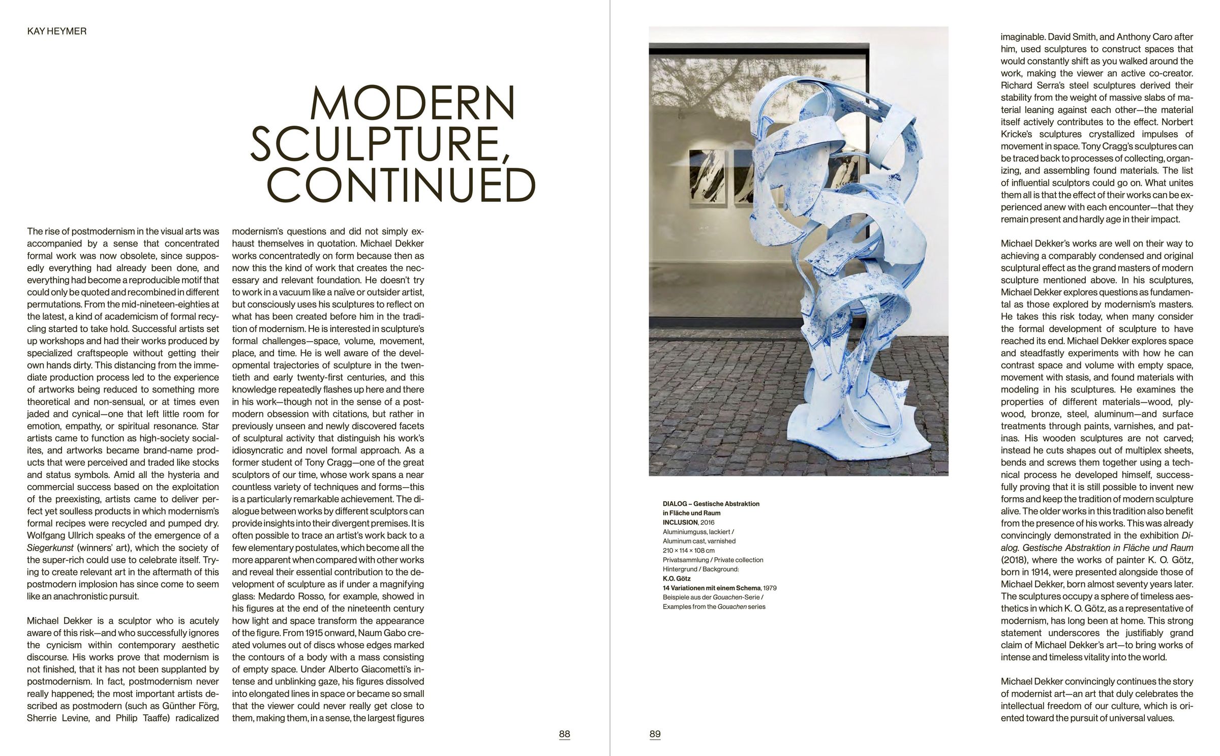 Liquidist die erste Monografie von Michael Dekker und bietet einen umfassenden Überblick über sein Schaffen der letzten 15 Jahre. Essays von Prof. Dr. Thomas A. Lange, Kay Heymer und Jörg Mascherrek ordnen sein Werk in die Tradition der modernen Bildhauerei ein und heben die Relevanz von Rhythmus und Musik hervor.