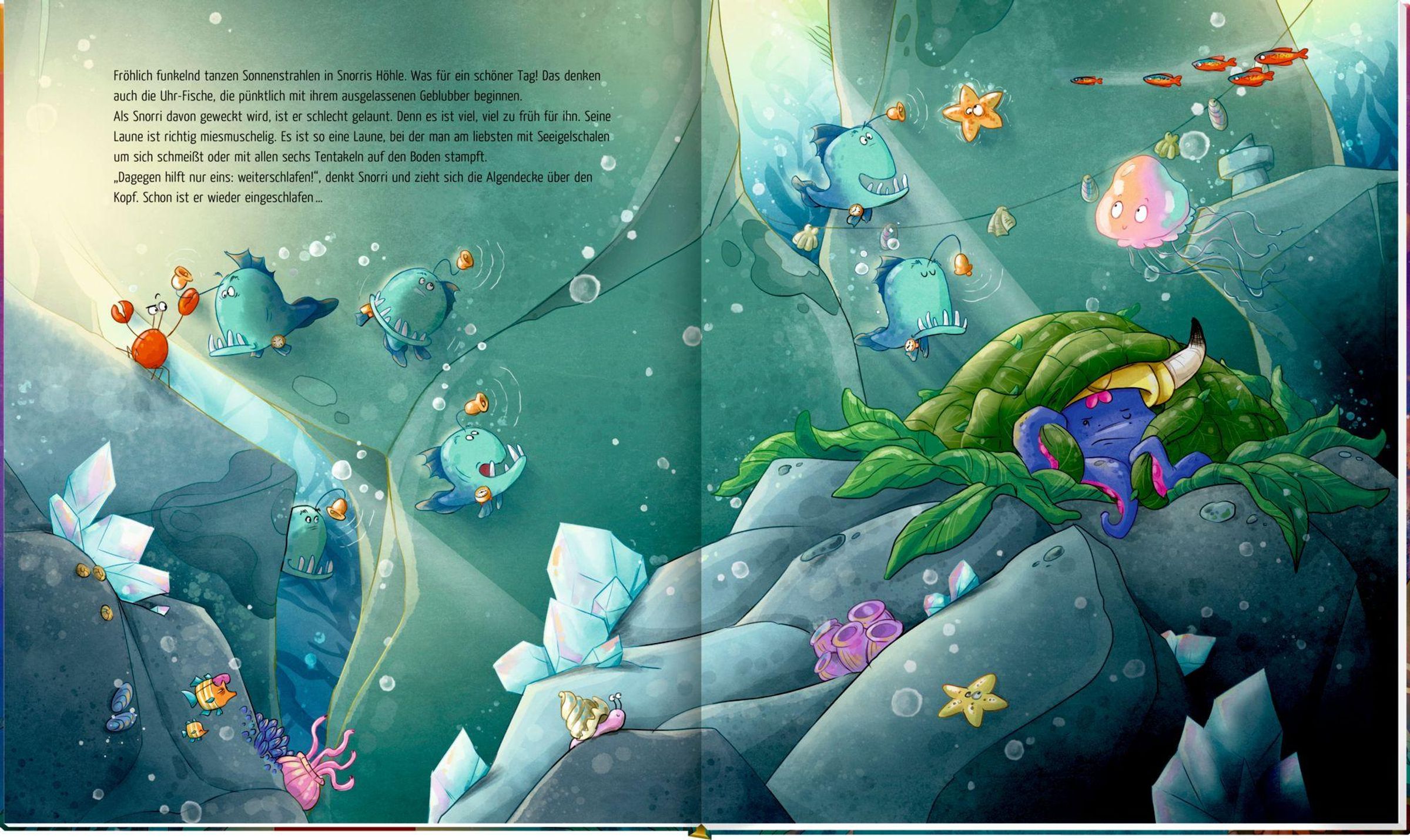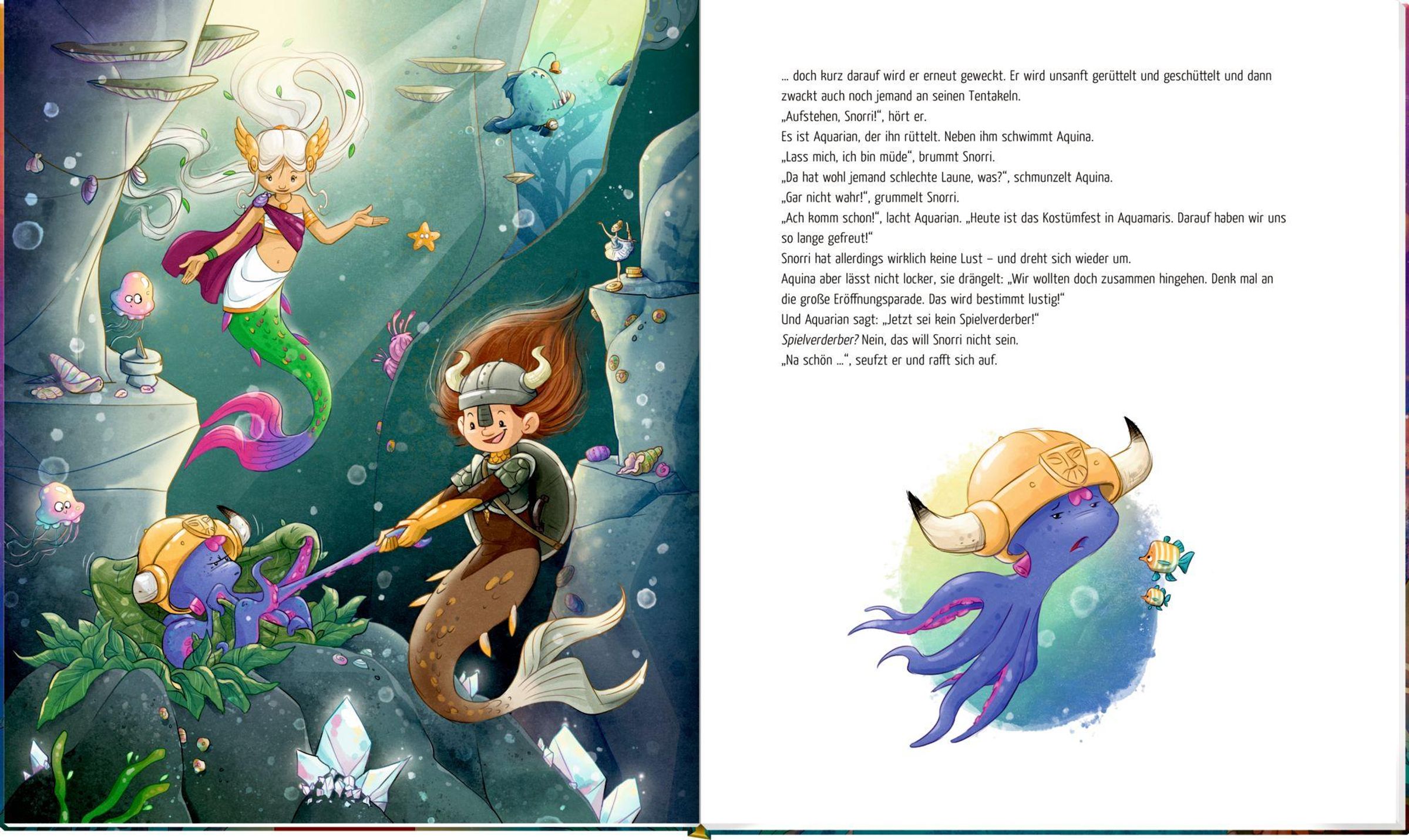 Was für ein schöner Tag! Das denken auch die Uhr-Fische, die Snorri mit ausgelassenem Geblubber wecken. Aber Snorri hat schlechte Laune. Sogar richtig miserabel miesmuschelige Laune. So eine, bei der man mit Seeigelschalen um sich schmeißt oder mit allen sechs Tentakeln auf den Boden stampft! Dagegen hilft nur eins: weiterschlafen ... Doch Snorri hat die Rechnung ohne seine besten Freunde gemacht. Aquina und Aquarian wollen zum großen Kostümfest in Aquamaris und Snorri soll natürlich mitkommen. Ob das wohl gut geht ...?