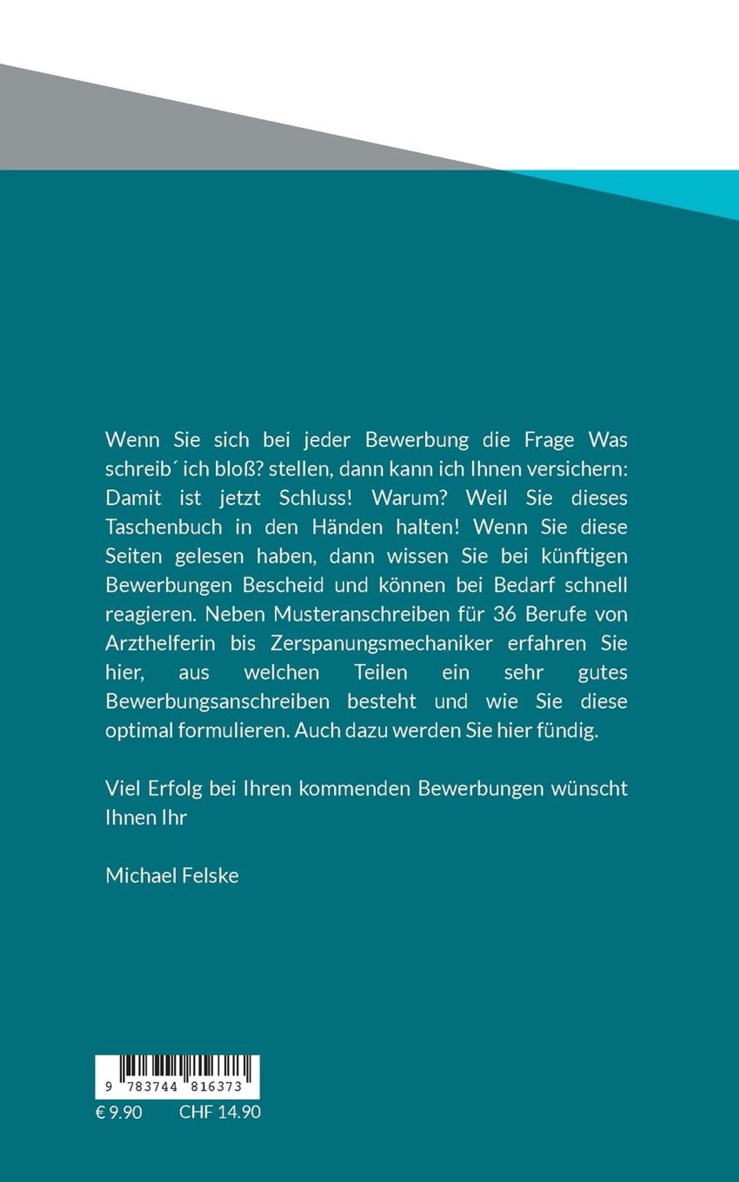 Wenn Sie sich bei jeder Bewerbung die Frage Was schreib¿ ich bloß? stellen, dann kann ich Ihnen versichern: Damit ist jetzt Schluss! Warum? Weil Sie dieses Taschenbuch in den Händen halten! Wenn Sie diese Seiten gelesen haben, dann wissen Sie bei künftigen Bewerbungen Bescheid und können bei Bedarf schnell reagieren. Neben Musteranschreiben für 36 Berufe von Arzthelferin bis Zerspanungsmechaniker erfahren Sie hier aus welchen Teilen ein sehr gutes Bewerbungsanschreiben besteht und wie Sie diese optimal formulieren. Auch dazu werden Sie hier fündig.