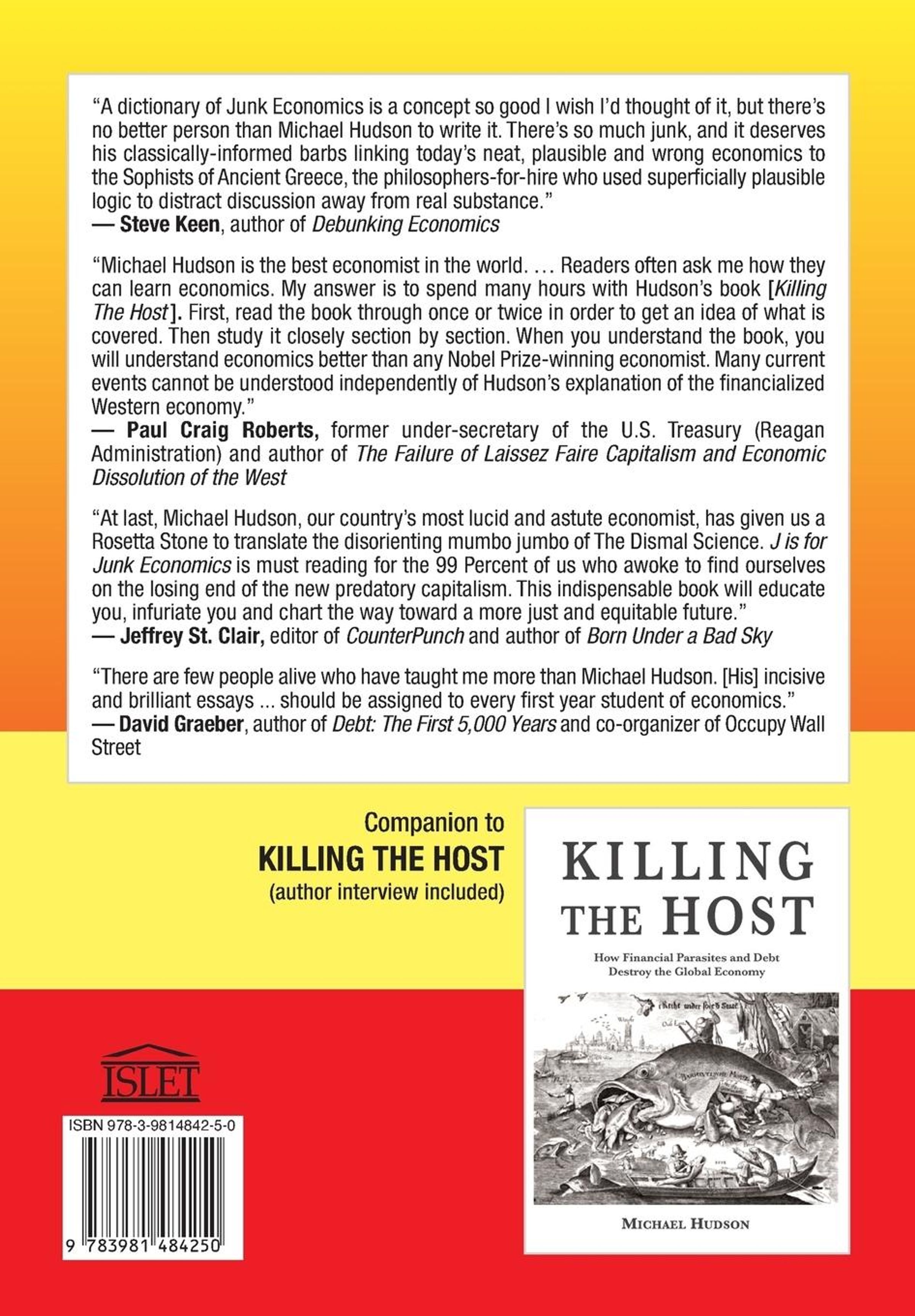 J IS FOR JUNK ECONOMICS is an A-to-Z guide that explains how the world economy really works -- and who the winners and losers are. The book includes more than 400 concise and acerbic entries, several essays, and a full topic index. Expanding on KILLING THE HOST: HOW FINANCIAL PARASITES AND DEBT DESTROY THE GLOBAL ECONOMY, Prof. Hudson's new book covers contemporary terms that are misleading or poorly understood as well as many important concepts that have been abandoned -- many on purpose -- from the long history of political economy.
