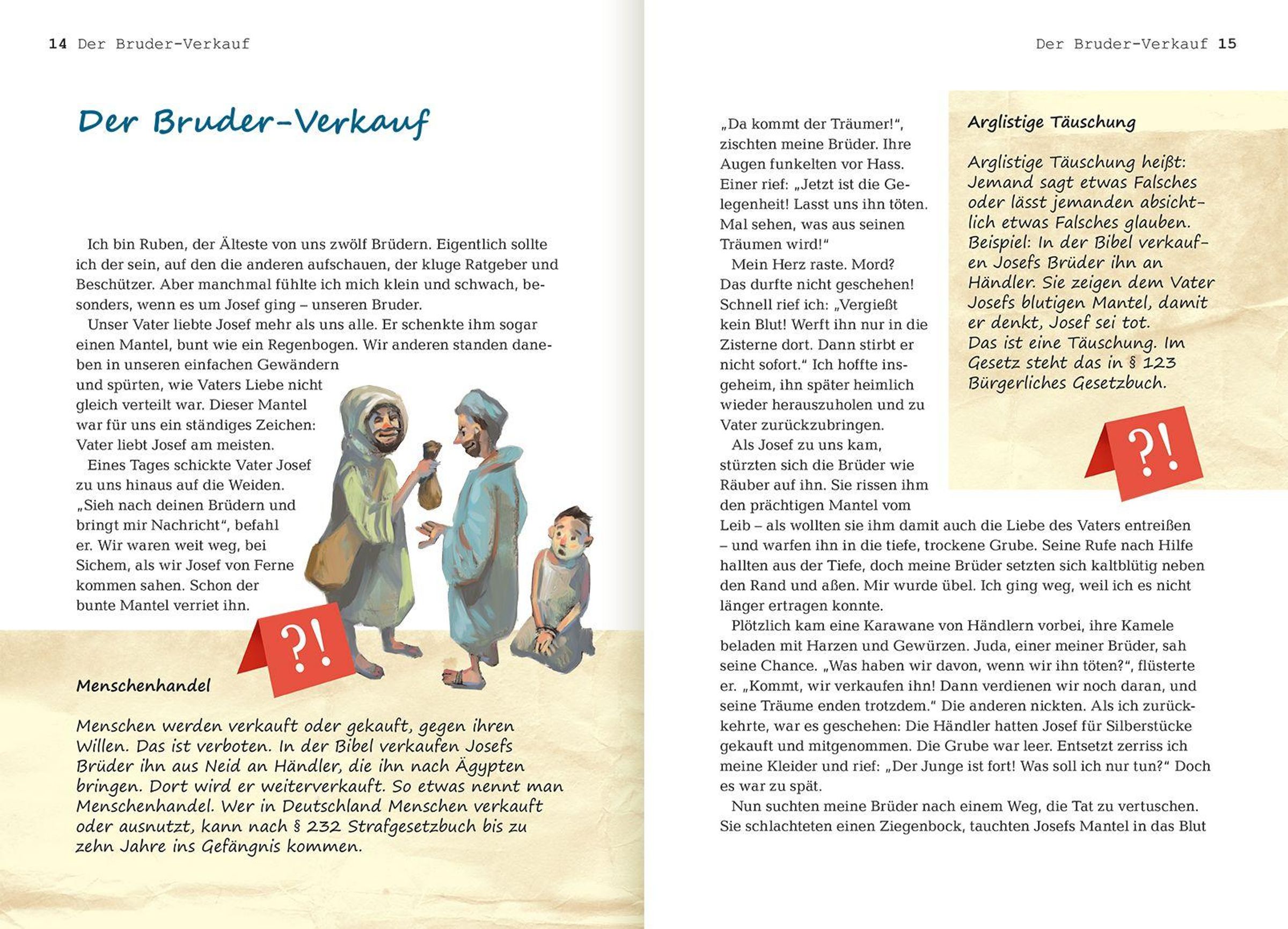 Der Obst-Betrug (Sündenfall), der Ernte-Streit (Kain und Abel), der Linsen-Handel (Jakob und Esau), der Ziegen-Trick (Jakob und Laban), der Bruder-Verkauf (Josef), die Haar-Kraft (Simson), der Riesen-Kampf (David und Goliat), das Schrift-Rätsel (Daniel), die Himmels-Erscheinung (Jesus wird geboren), der See-Geist (Jesus auf dem Wasser), die Schlaf-Krankheit (Tochter von Jairus), der Hilfe-Skandal (Der barmherige Samariter), die Weinberg-Morde (Das Gleichnis von den Pächtern im Weinberg), die Grab-Verschwörung (Jesus lebt), das Gefängnis-Geheimnis (Paulus und Silas).