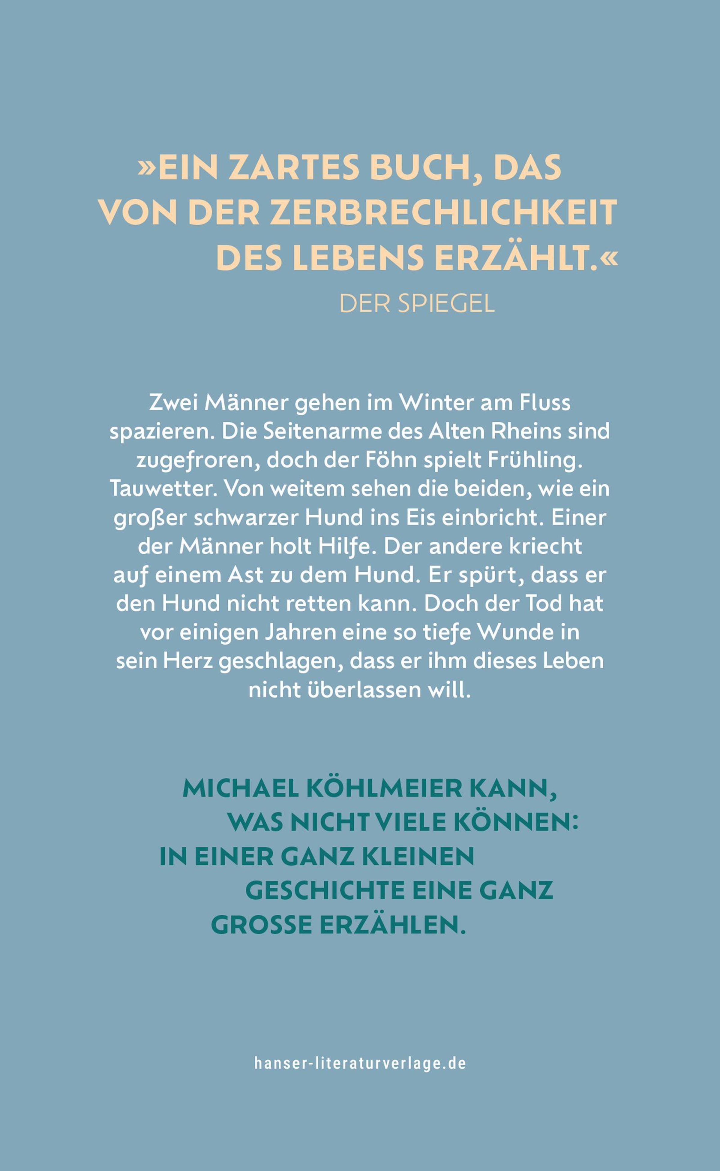 Alter Rhein. Zwei Männer spazieren am Ufer entlang, ins Gespräch vertieft. Es ist tiefer Winter, die Seitenarme des Flusses sind zugefroren, doch der Föhn spielt Frühling, es taut. Von weitem sehen die beiden einen großen schwarzen Hund über das Eis auf sie zulaufen. Plötzlich bricht er ins Eis ein. Der Hund kämpft um sein Leben. Einer der Männer holt Hilfe. Der andere, er ist Schriftsteller, bleibt alleine mit dem Hund. Er bricht einen großen Ast von einer Weide und kriecht auf diesem zu dem Hund. Er fasst ihn an den Vorderläufen. Der Hund verbeißt sich in seinem Ärmel. Er wird den Hund nicht retten können. Doch der Tod hat vor einigen Jahren eine so tiefe Wunde in sein Herz geschlagen, dass er ihm unter keinen Umständen dieses Leben überlassen will. Er hält den Hund verzweifelt fest, auch als der sich schon längst nicht mehr rührt. Michael Köhlmeier kann, was nicht viele können: in einer ganz kleinen Geschichte eine ganz große erzählen.