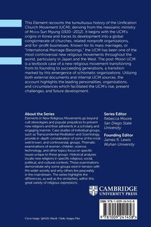 This Element recounts the tumultuous history of the Unification Church Movement, deriving from the messianic ministry of MOON Sun Myung (1920-2012). It begins with the UCM's origins in Korea and traces its development into a global conglomerate of churches, related nonprofit organizations, and for-profit businesses. Known for its mass marriages, or 'International Marriage Blessings,' the UCM has been one of the most controversial new religious movements throughout the world, particularly in Japan and the West. Moon fit Weber's classic definition of the charismatic leader. The post-Moon UCM is a textbook case of a new religious movement transitioning from its founding to succeeding generations. Utilizing both external documents and internal UCM sources, the account highlights the leading personalities, organizations, and circumstances which facilitated the UCM's rise, its present challenges, and future development.