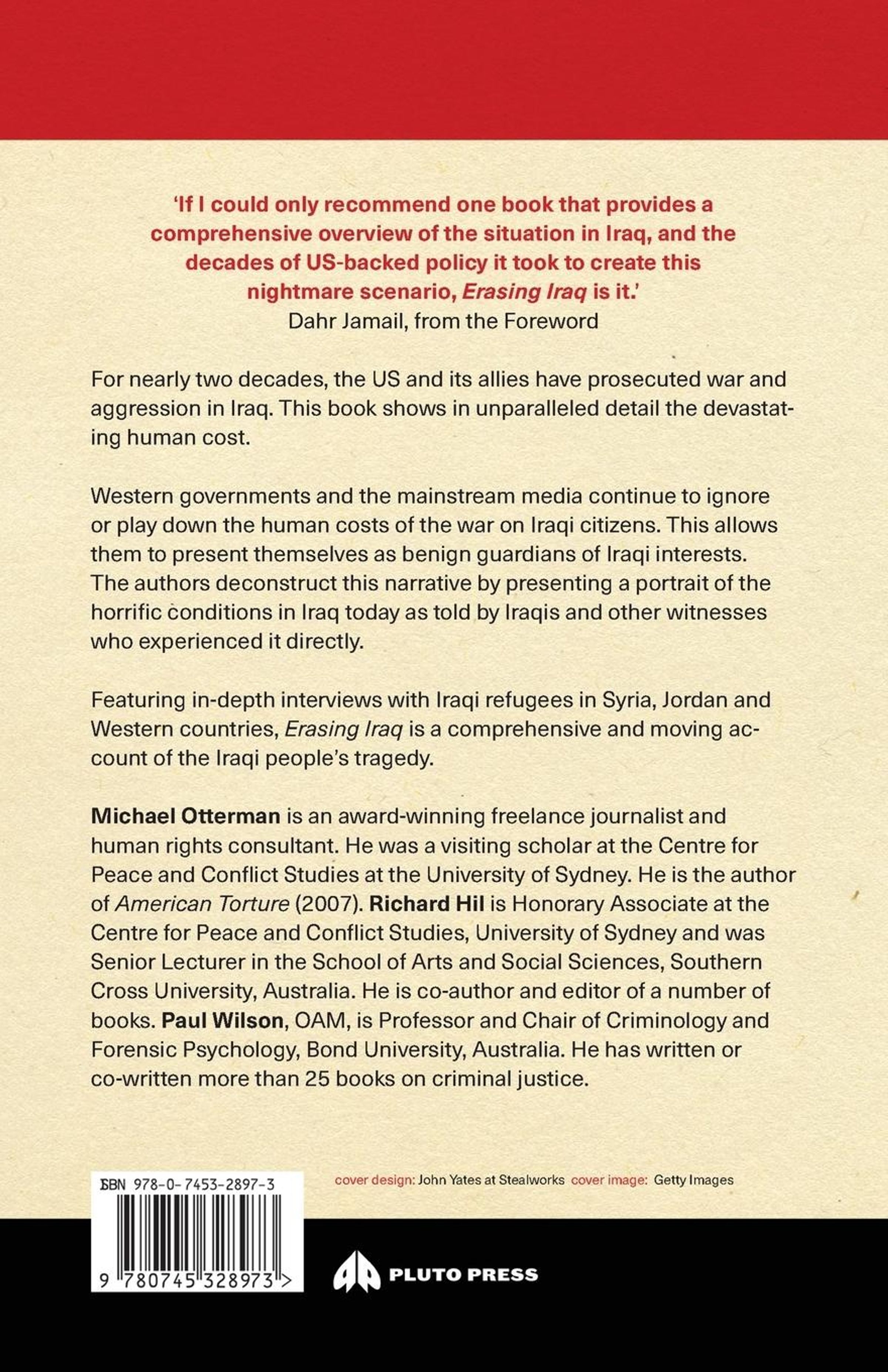 For nearly two decades, the US and its allies have prosecuted war and aggression in Iraq. Erasing Iraq shows in unparalleled detail the devastating human cost of the war in Iraq. Western governments and the mainstream media continue to ignore or play down the human costs of the war on Iraqi citizens This has allowed them to present their role as the benign guardians of Iraqi interests. The authors deconstruct this narrative by presenting a portrait of the total carnage in Iraq today. From Iraqi refugees in Syria, Jordan and the West, to civilians left behind, and other witnesses, this the story of the war told by those who experienced it firsthand.