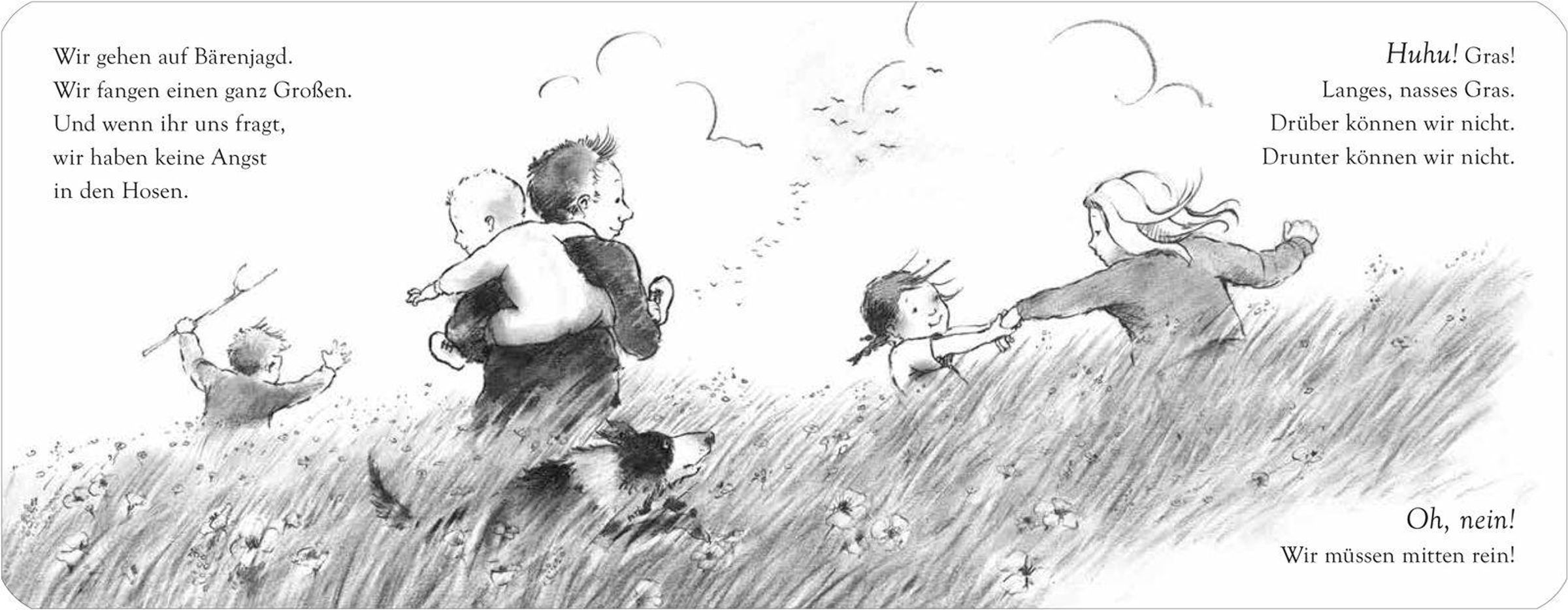 Dieser Klassiker lädt Kinder, Eltern und Erzieher*innen seit einem Viertel Jahrhuntert zu einem gemeinsamen Abenteuer ein und schickt sie auf "Bärenjagd". Dabei wird "wischel, waschel" durchs hohe Gras gerannt, "plitsch, platsch" in den Fluss gesprungen und "quitsch, quatsch" durch den Schlamm gewatet. Helen Oxenbury zeigt mit ihren aufregend schönen und kuschelig warmen Bildern, wie viel sie von Kindern und von Büchern für Kinder versteht. Eine herrlich aufregende Geschichte, unvergesslich, humorvoll und treffend umgesetzt.