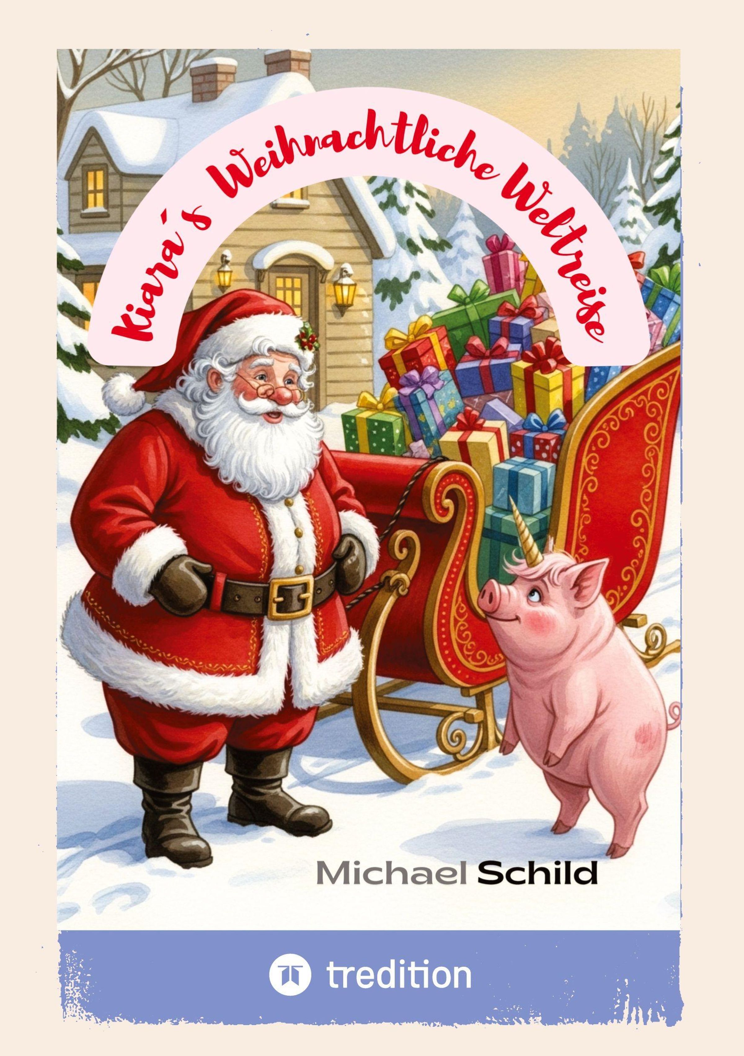 Text: "Kiara's Weihnachtliche Weltreise", "Michael Schild". Illustration: Weihnachtsmann mit Schlitten, Geschenke, Einhorn-Schwein., Buch