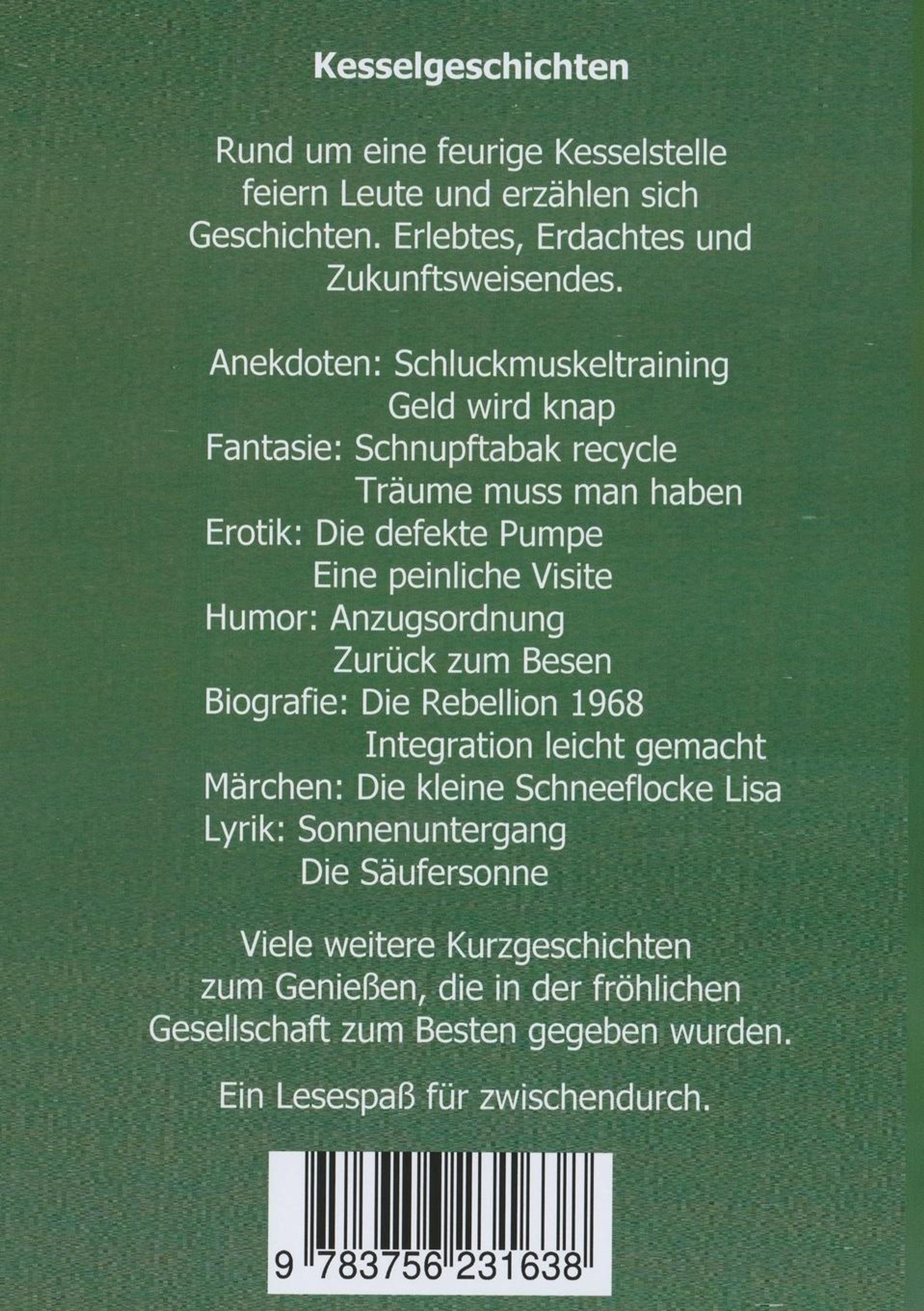 Anekdoten: Schluckmuskeltraining, Geld wird knapp Fantasie: Schnupftabak recycle, Träume muss man haben. Erotik: die defekte Pumpe, peinliche Visite. Humor: Anzugsordnung, Zurück zum Besen. Biografie: die Rebellion 1968, Integration leicht gemacht. Märchen: die kleine Schneeflocke Lisa. Lyrik: Sonnenuntergang, kein zurück ins Glück.