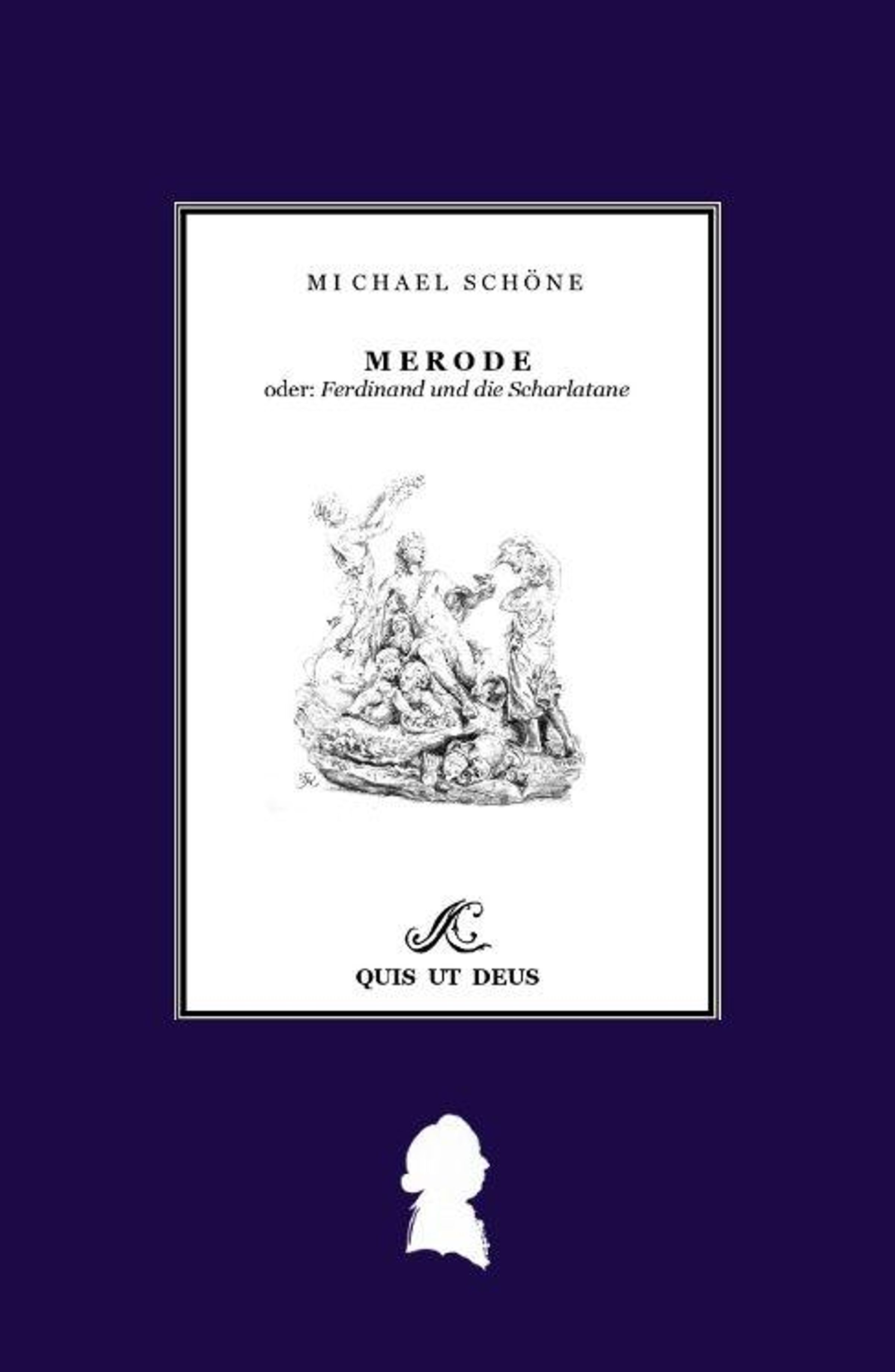 Text: "Michael Schöne, Merode oder: Ferdinand und die Scharlatane, Quis ut Deus". Ein zentrales Bild zeigt Figuren, umrahmt von einem lila Hintergrund., Buch