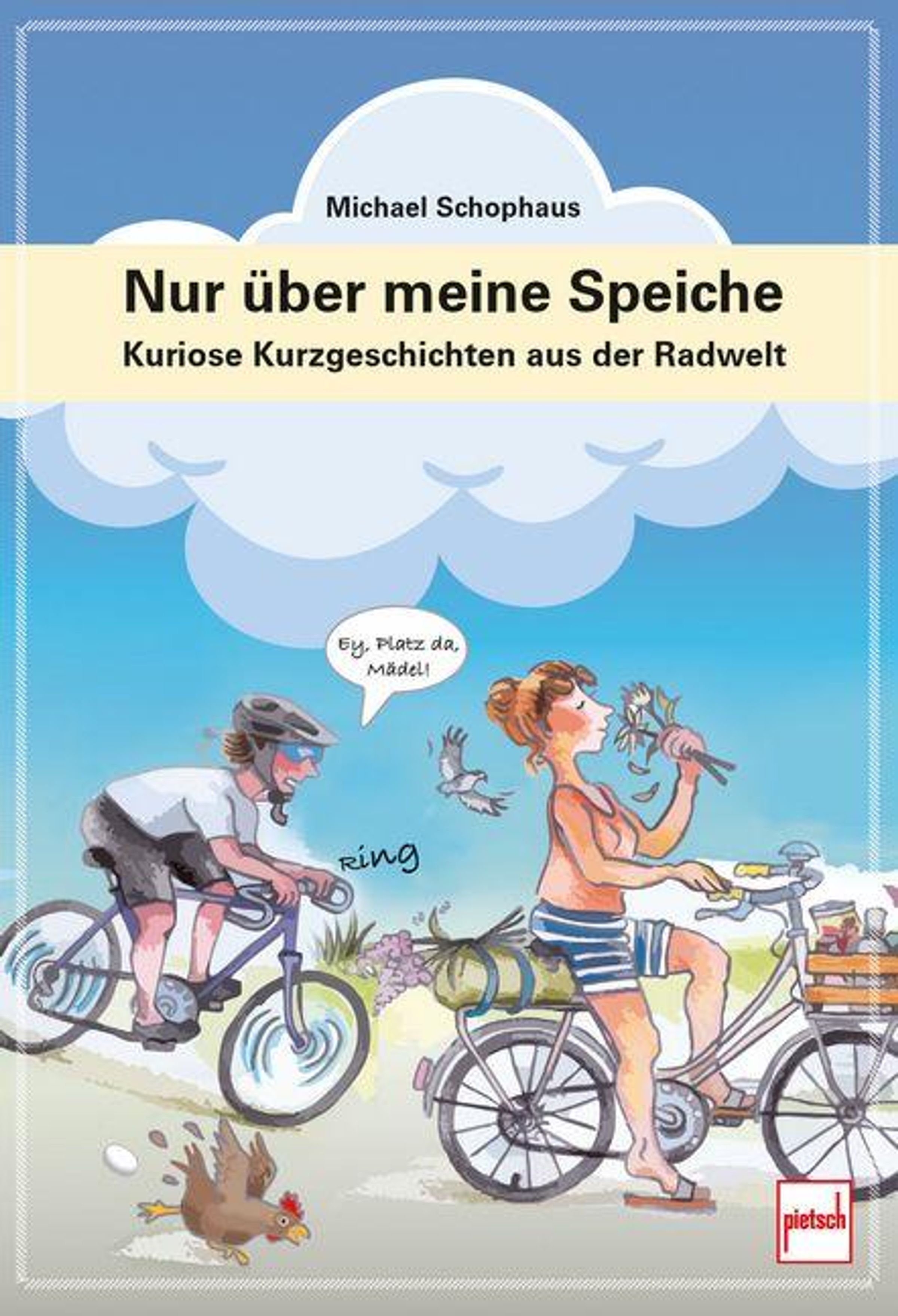 Titel: "Nur über meine Speiche", darunter "Kuriose Kurzgeschichten aus der Radwelt". Zwei Radfahrer mit Wolkenhintergrund., Buch