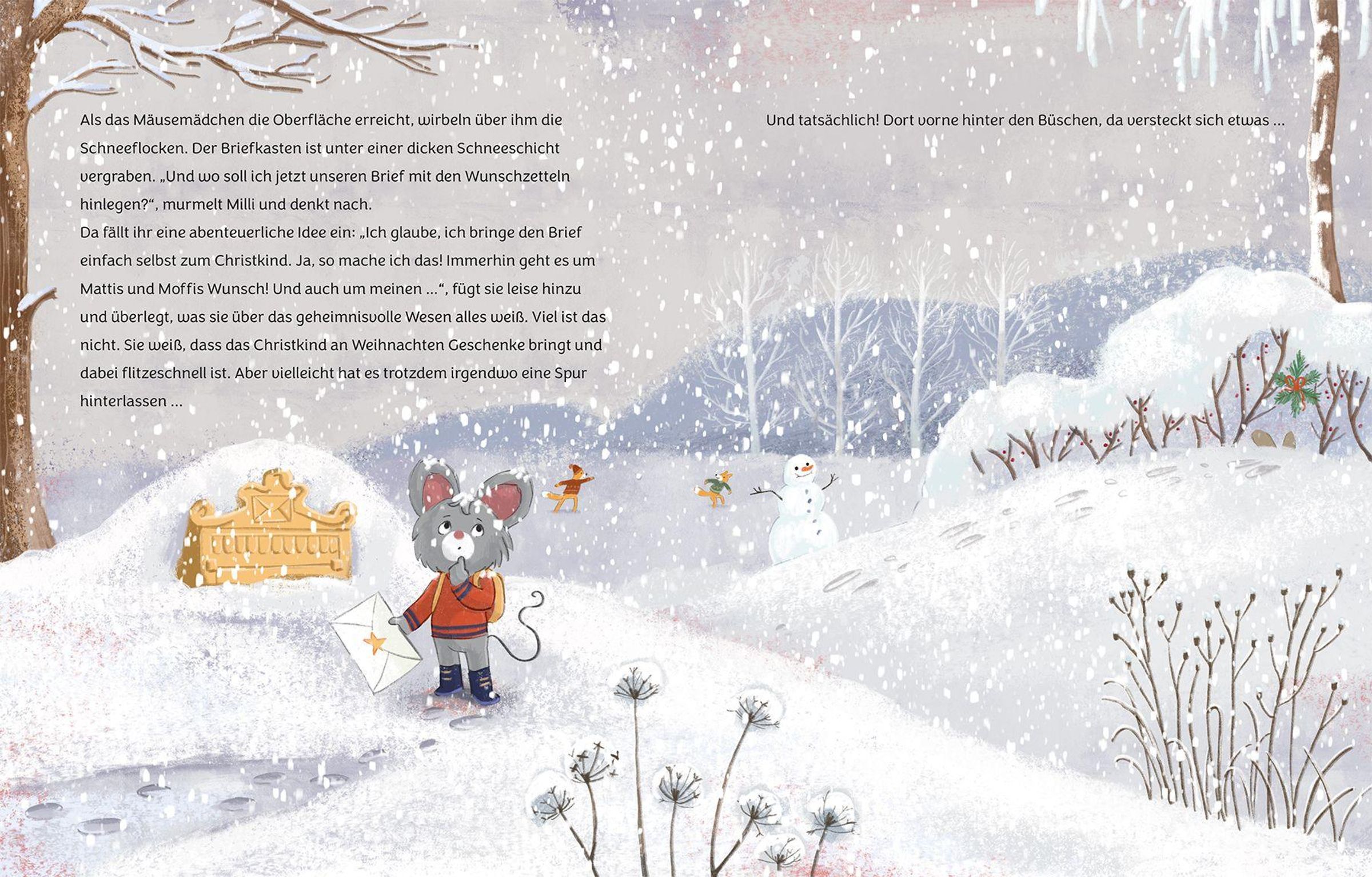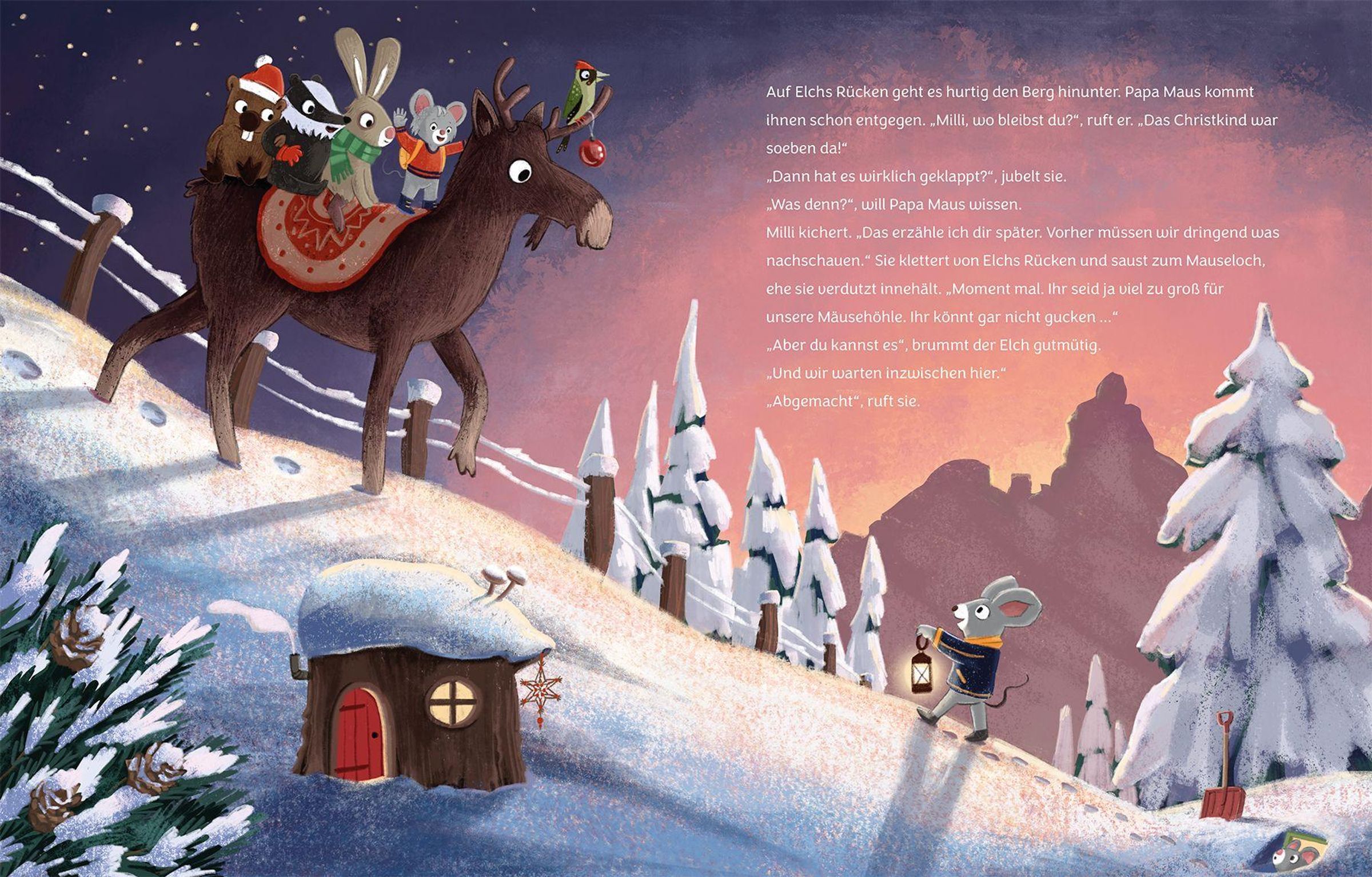 „Auf dem Weg zum Christkind“, darunter Tiere auf einem Elch im Schnee, im Hintergrund ein dunkler, verschneiter Wald., Buch