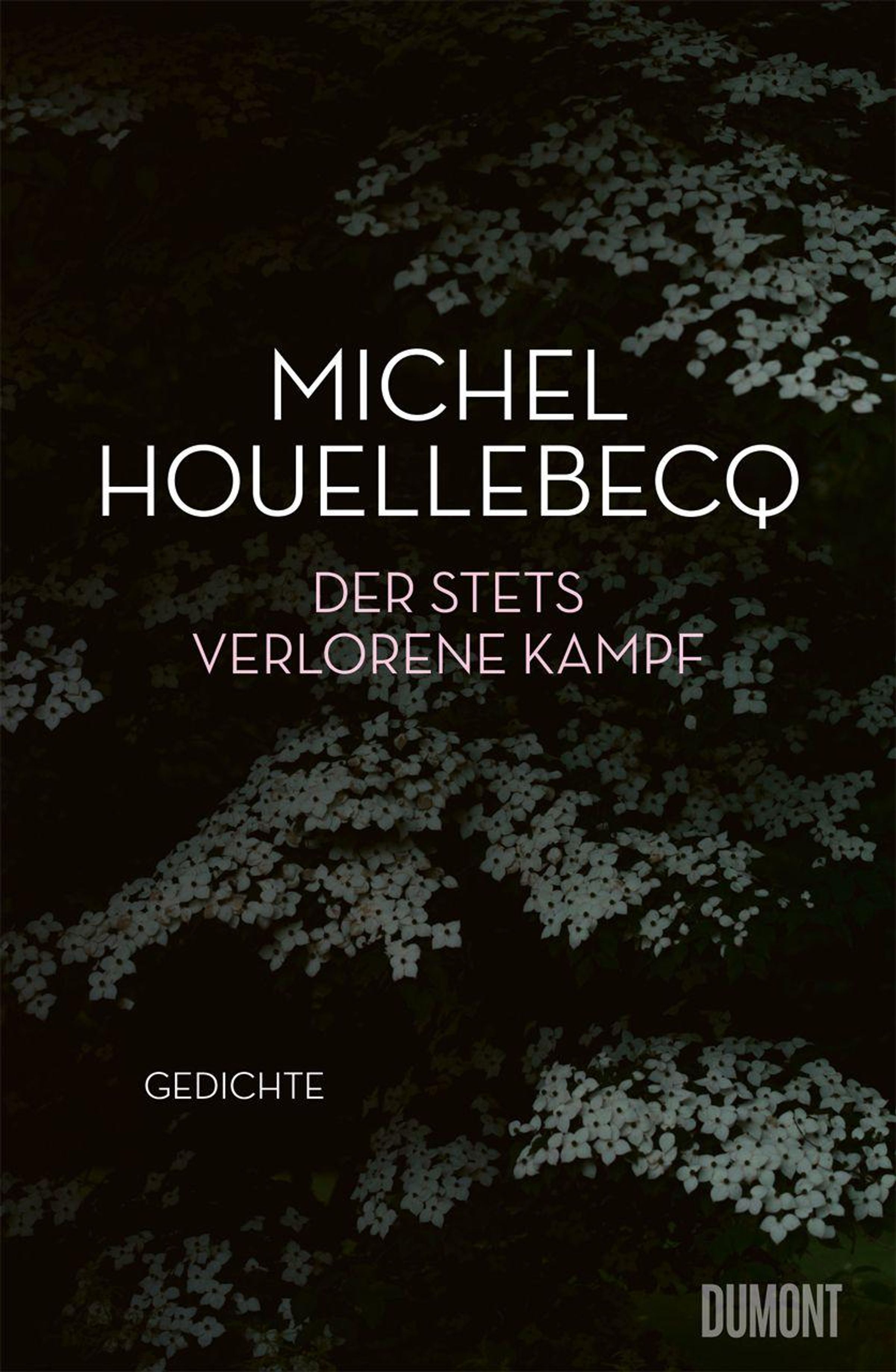 Text: "Michel Houellebecq. Der stets verlorene Kampf. Gedichte. DUMONT." Dunkler Hintergrund mit weißen Blumen., Buch