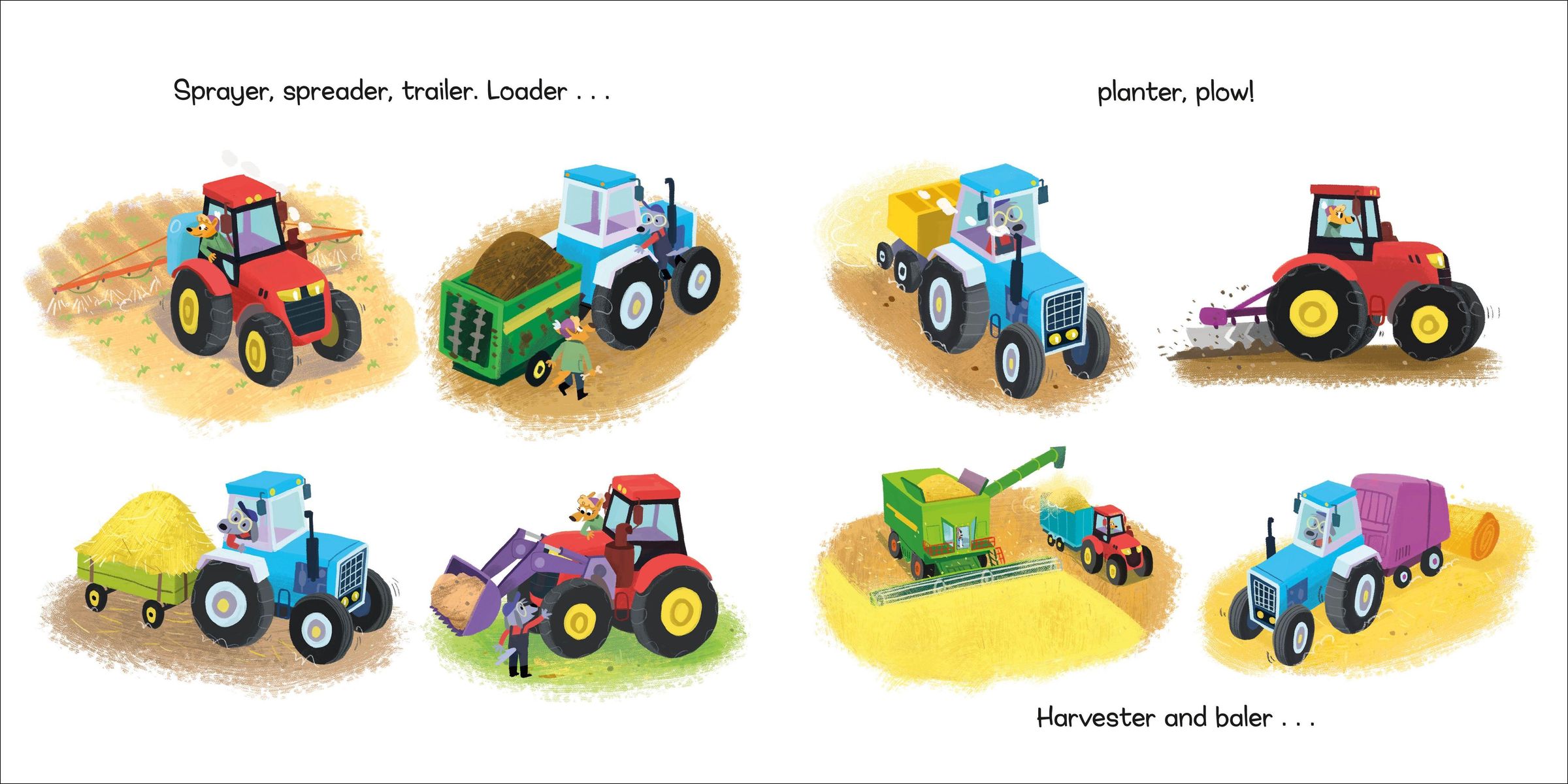 Rev up your engines for a farmyard adventure with tractors and their doggy drivers! This picture book on oversized card stock is tailor-made for little readers and a perfect gift for vehicle-loving kids and new parents. Perfect for fans of Tractor Mac, Little Excavator, and Good Night, Good Night Construction Site.