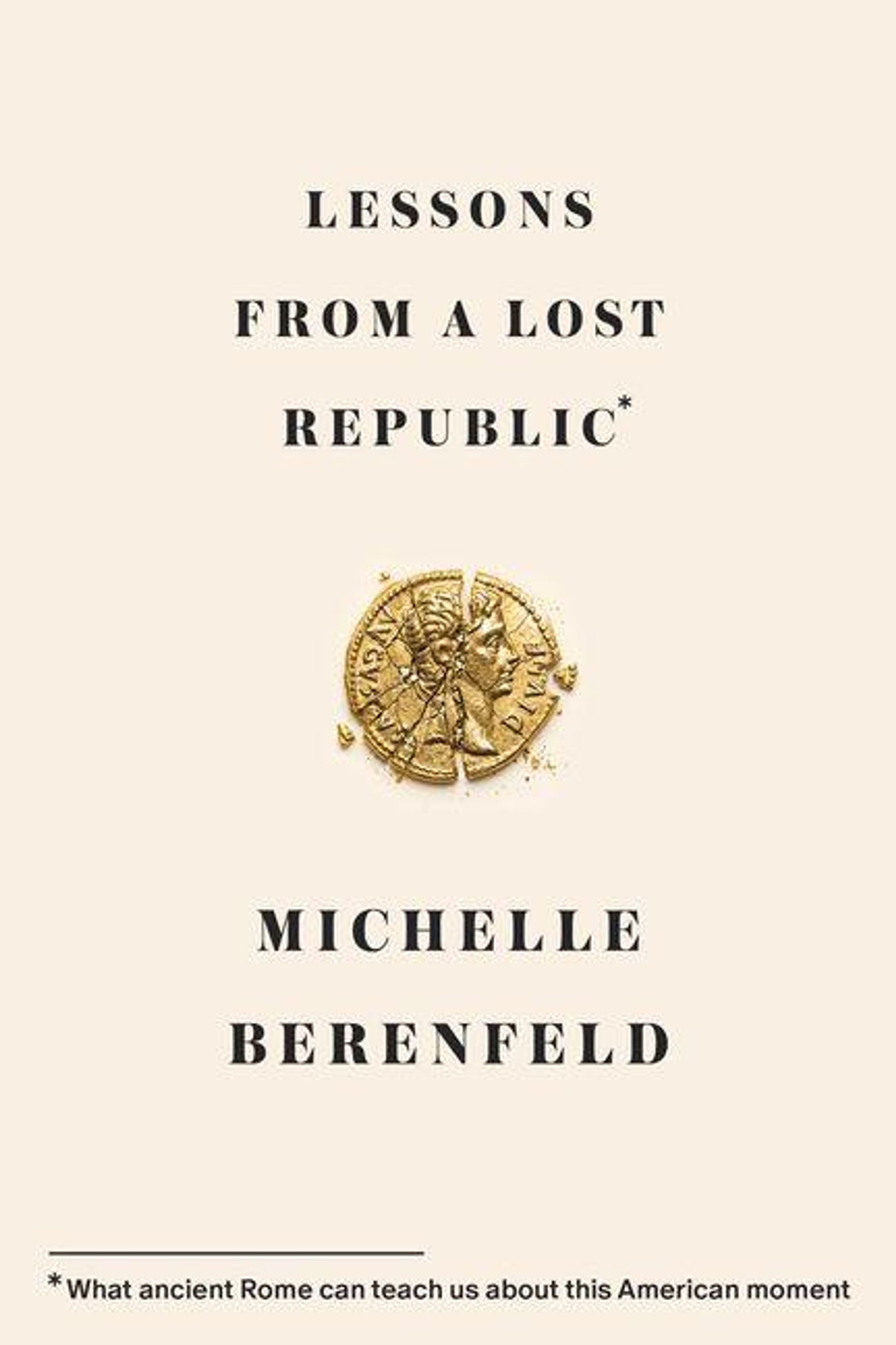 "LESSONS FROM A LOST REPUBLIC" von Michelle Berenfeld. Goldene, zersprungene Münze. Fußnote: "What ancient Rome can teach us...", Buch