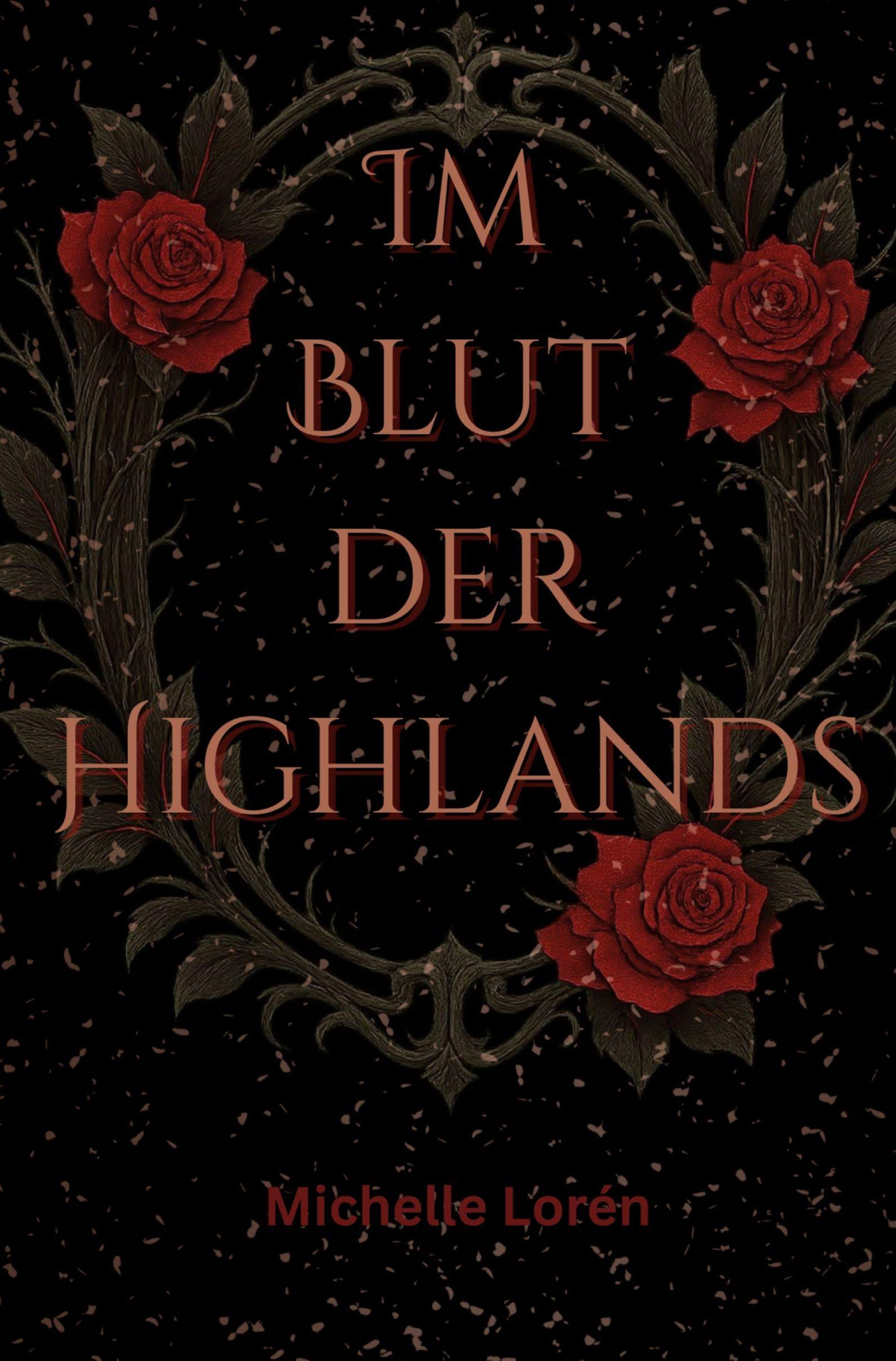 "IM BLUT DER HIGHLANDS" steht in roter Schrift auf schwarzem Hintergrund, umrahmt von roten Rosen und dunkelgrünen Blättern., Buch