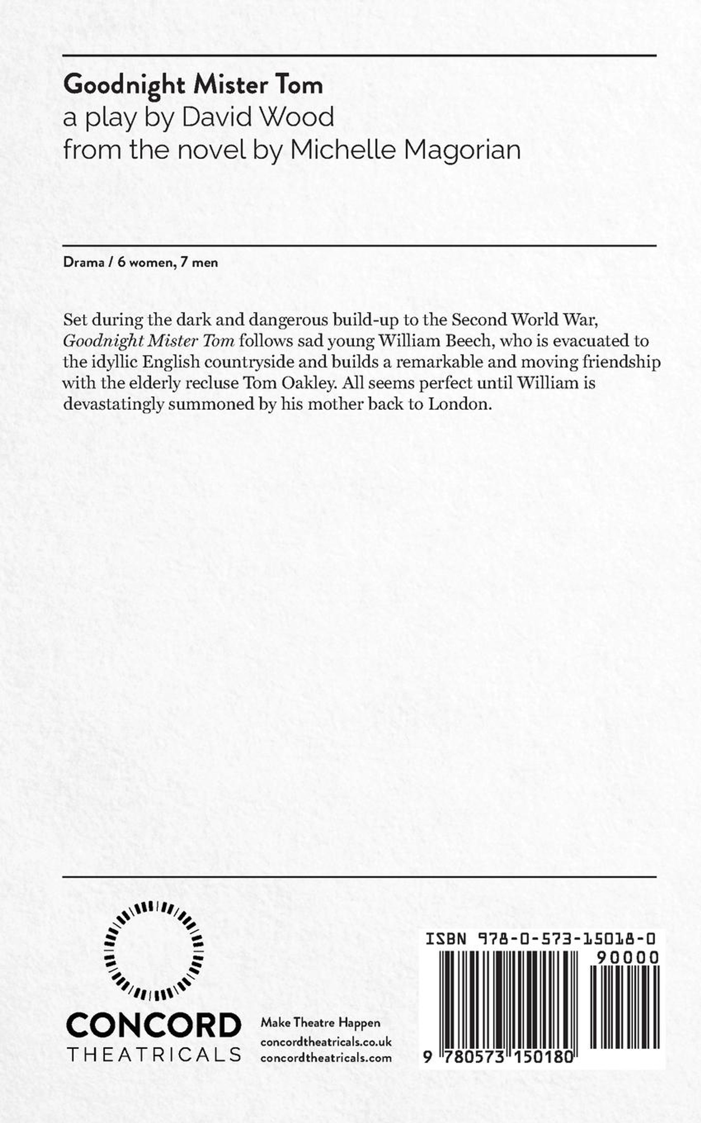 Set during the dark and dangerous build-up to the Second World War, Goodnight Mister Tom follows sad young William Beech, who is evacuated to the idyllic English countryside and builds a remarkable and moving friendship with the elderly recluse Tom Oakley. All seems perfect until William is devastatingly summoned by his mother back to London. 6 women, 7 men