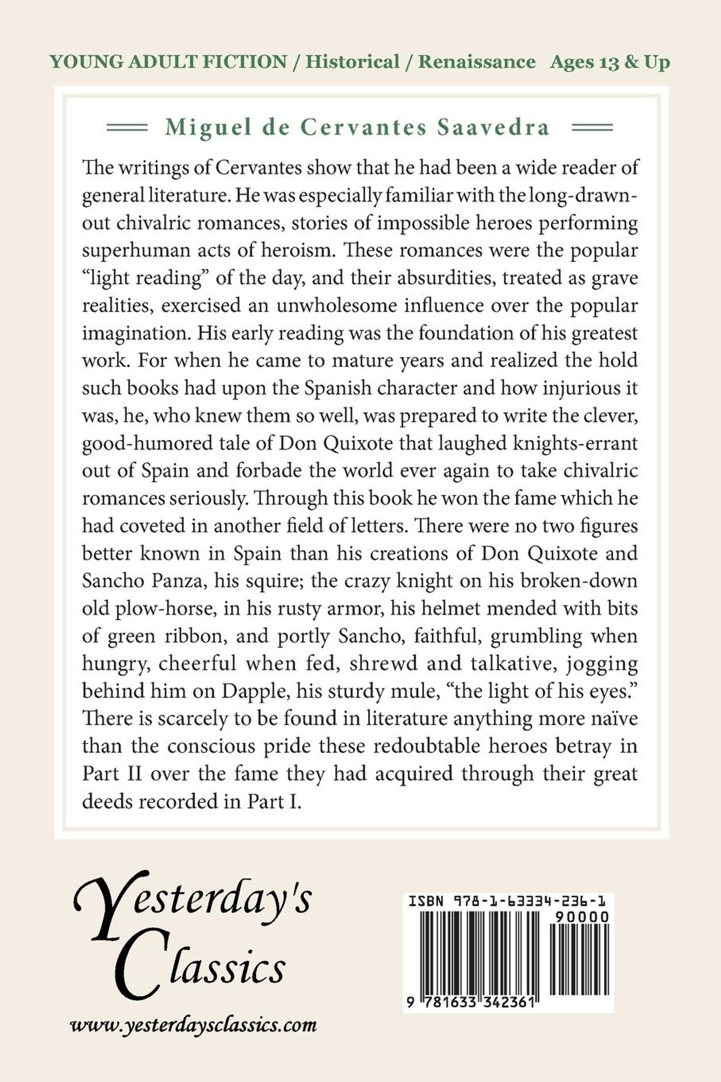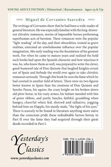 Widely recognized as the first novel in European literature, this edition is an adaptation of the work written in two parts in Spanish by Miguel de Cervantes Saavedra, translated by John Ormsby, and abridged and edited by Mabel F. Wharton, with dozens of footnotes to explain unfamiliar terms. Now younger students can enjoy the adventures of Don Quixote and Sancho Panza, his squire, featuring the crazy knight on his broken-down old plow-horse, in his rusty armor, his helmet mended with bits of green ribbon, and portly Sancho, faithful, grumbling when hungry, cheerful when fed, shrewd and talkative, jogging behind him on Dapple, his sturdy mule, "the light of his eyes."
