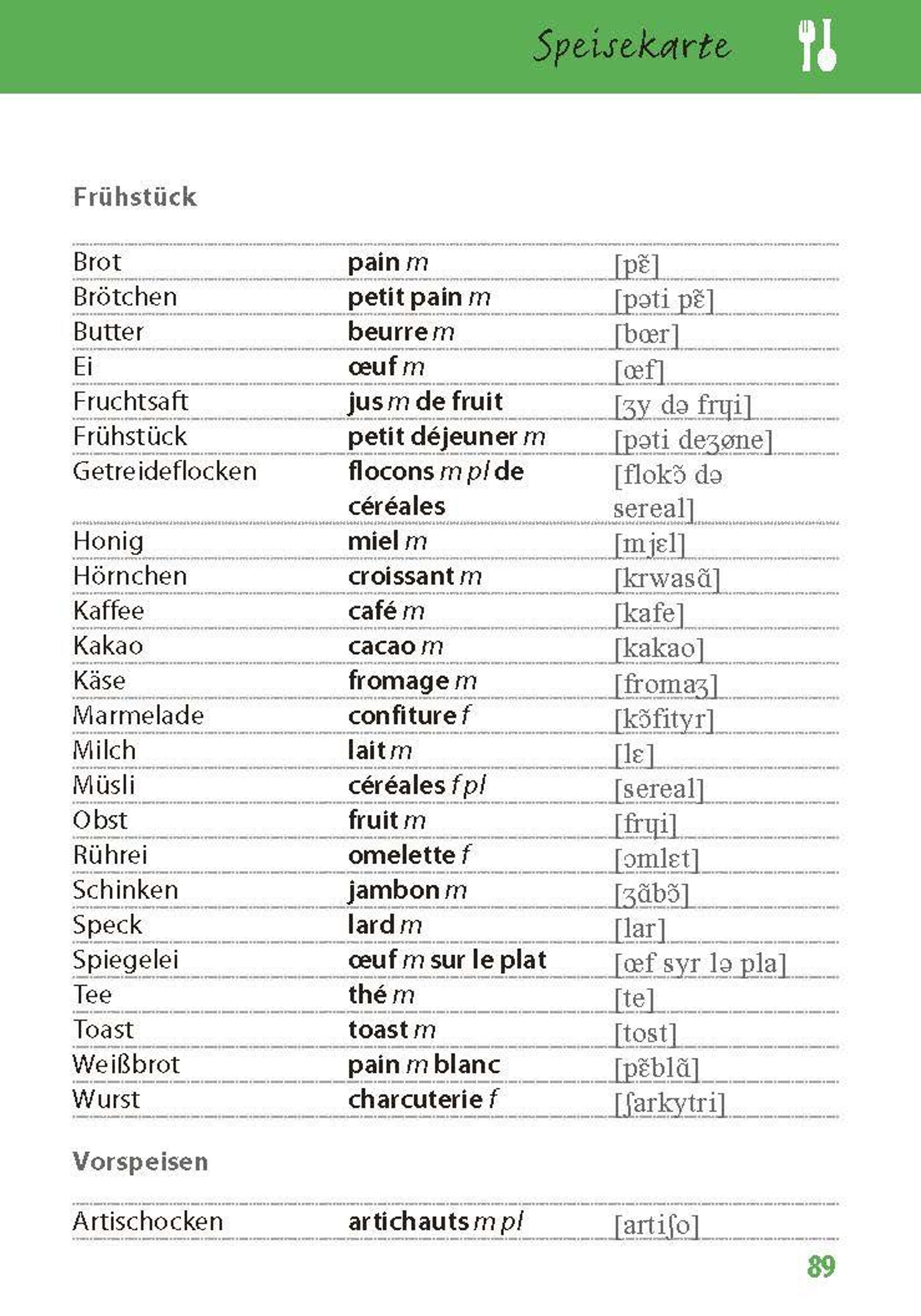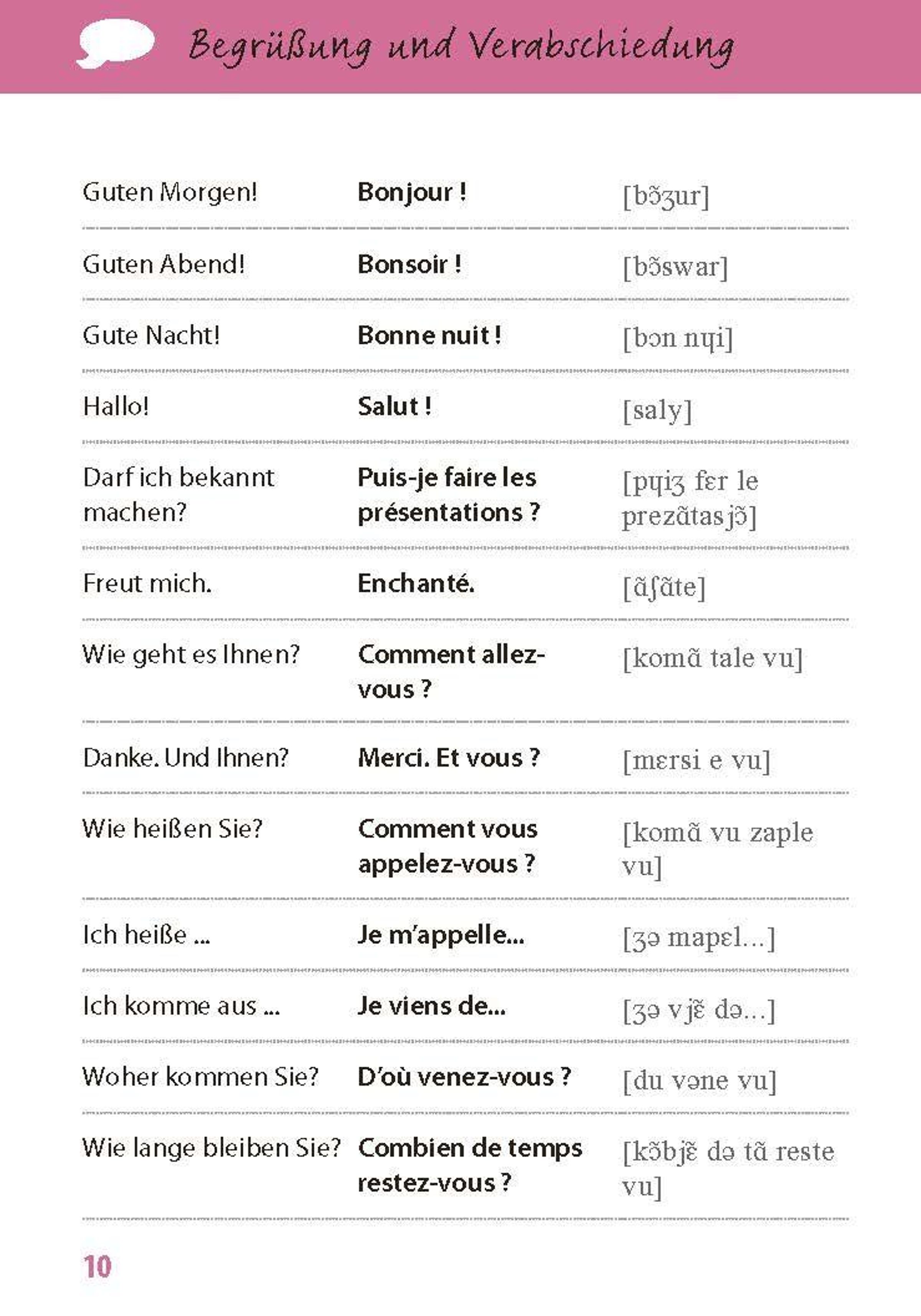 Der Sprachführer Französisch ist der ideale Begleiter für Reise und Urlaub, denn er macht einfache Verständigung auch ohne Französischkenntnisse möglich. Klar gegliedert nach Situationen bietet er praktische Hilfe mit den wichtigsten Wörtern, Sätzen und Wendungen. Zahlreiche Infokästen mit landeskundlichen Tipps helfen, sich in jeder Lage schnell zurechtzufinden. Die am häufigsten gebrauchten Wörter, Sätze und Redewendungen. Klare Gliederung nach Reisesituationen. Alle Einträge mit internationaler Lautschrift. 16 Zeigeseiten mit Fotos zu den Themen Essen & Trinken, Geschirr & Besteck, menschlicher Körper, Kleidung, Tiere, Fortbewegungsmittel. Mit Reisewörterbuch Französisch zum schnellen Nachschlagen. Übersichtliches Layout mit vielen Fotos und praktisches Format für die Jackentasche