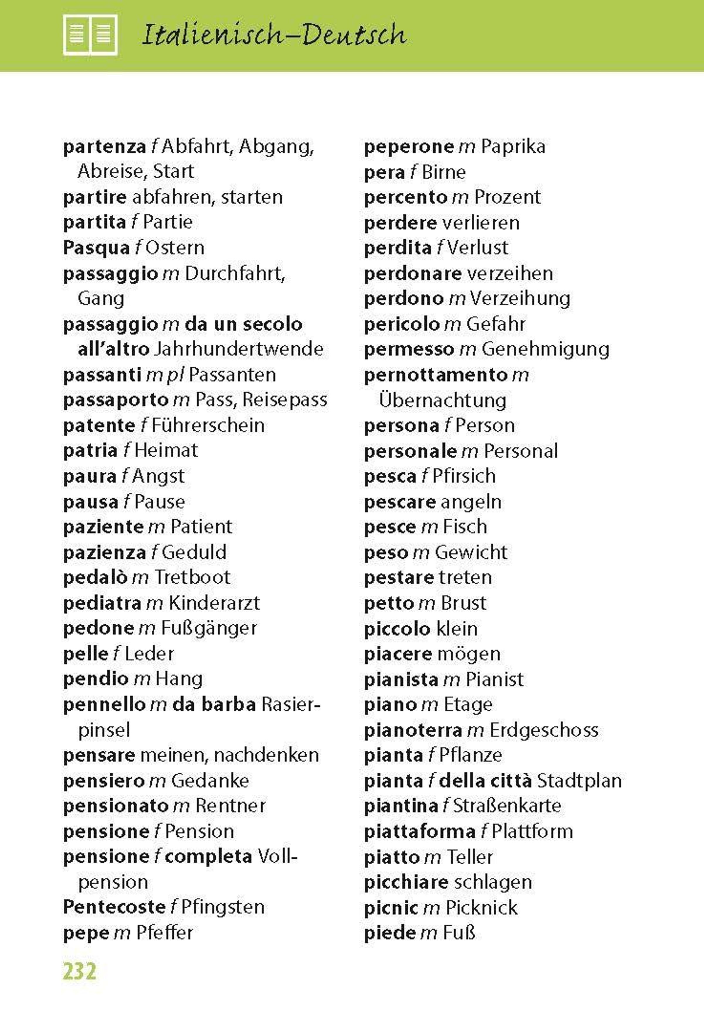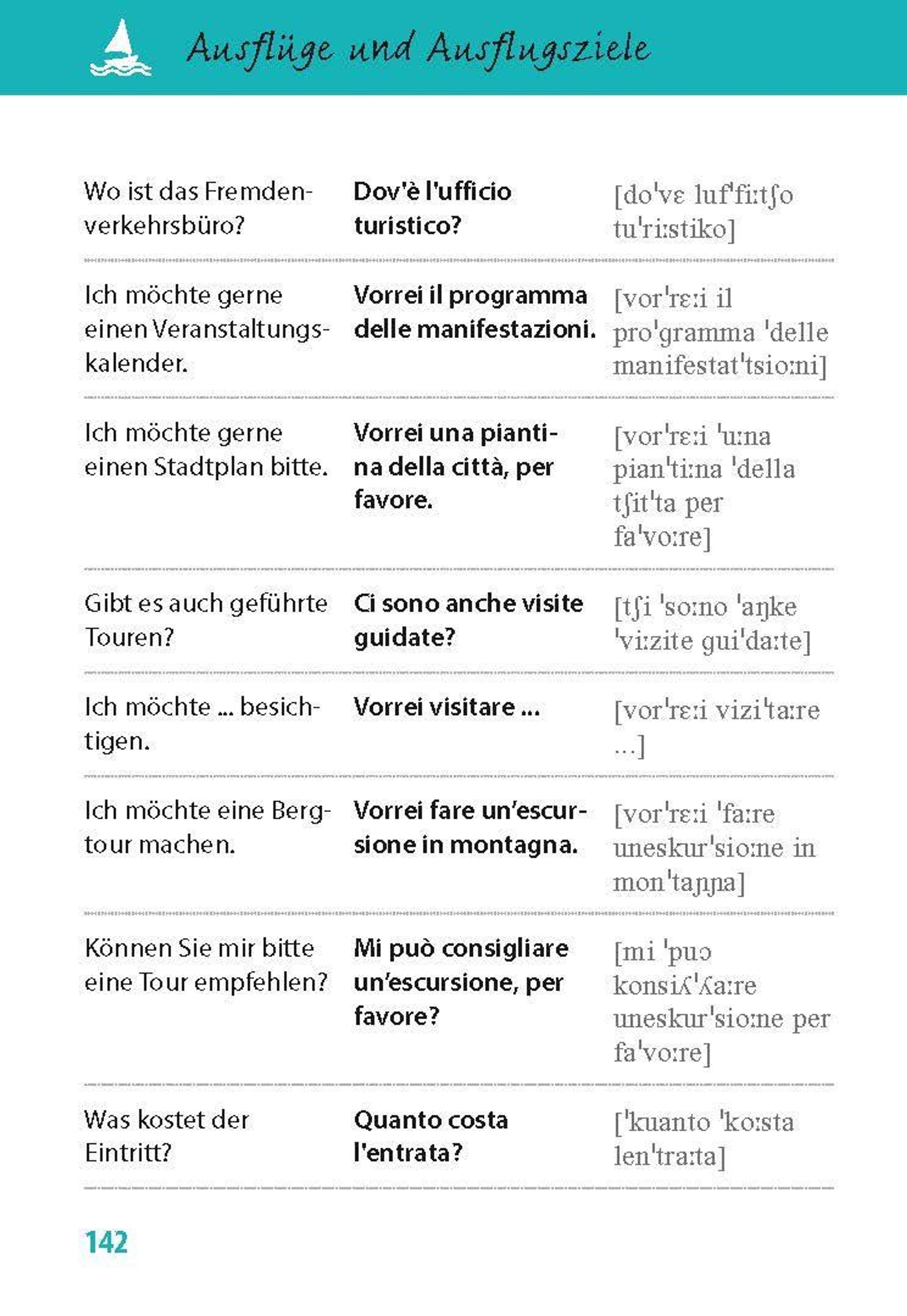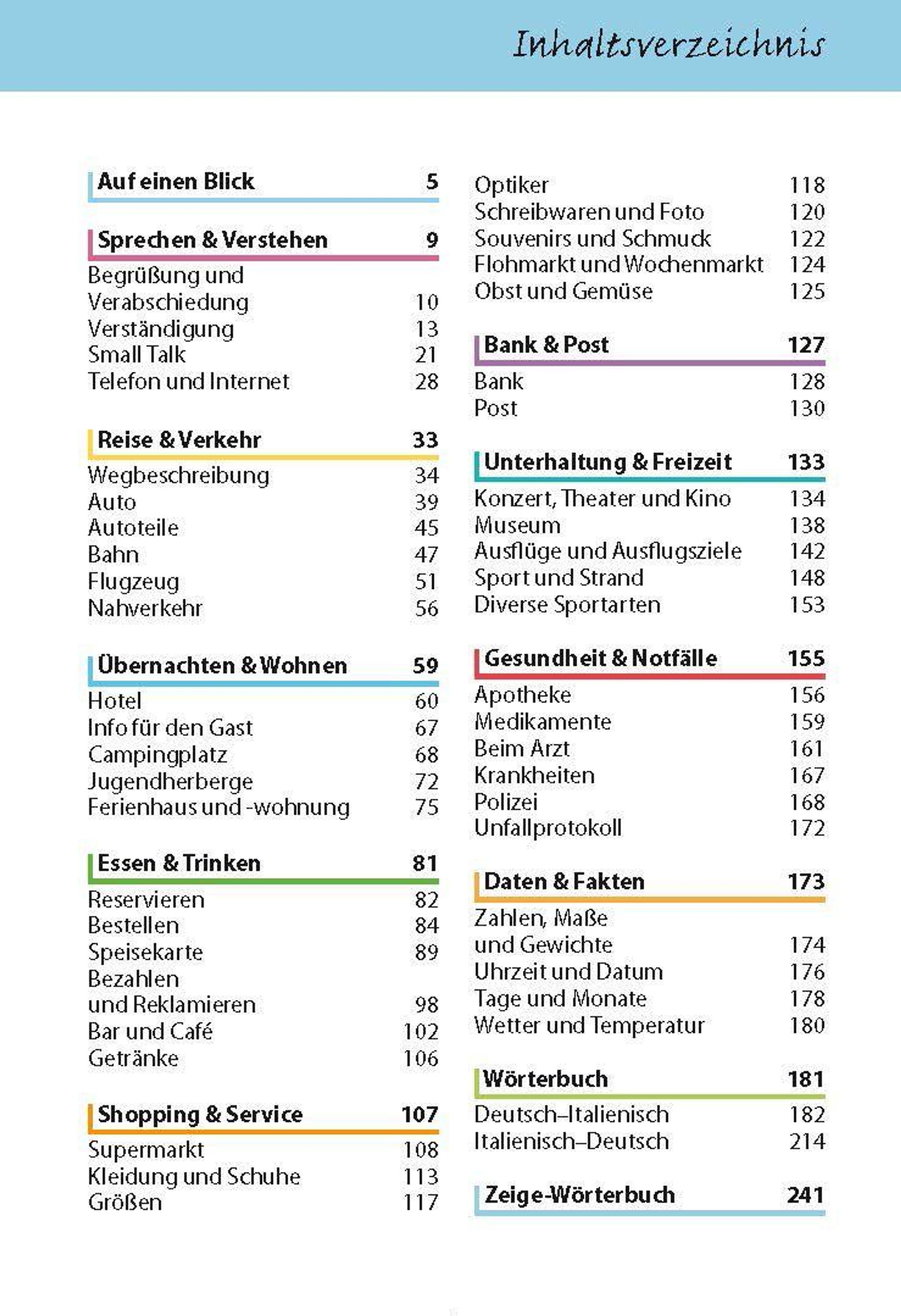 Der Sprachführer Italienisch ist der ideale Begleiter für Reise und Urlaub, denn er macht einfache Verständigung auch ohne Italienischkenntnisse möglich. Klar gegliedert nach Situationen bietet er praktische Hilfe mit den wichtigsten Wörtern, Sätzen und Wendungen. Zahlreiche Infokästen mit landeskundlichen Tipps helfen, sich in jeder Lage schnell zurechtzufinden. Die am häufigsten gebrauchten Wörter, Sätze und Redewendungen, klare Gliederung nach Reisesituationen. Alle Einträge mit internationaler Lautschrift. 16 Zeigeseiten mit Fotos zu den Themen Essen & Trinken, Geschirr & Besteck, menschlicher Körper, Kleidung, Tiere, Fortbewegungsmittel. Mit Reisewörterbuch Italienisch zum schnellen Nachschlagen. Übersichtliches Layout mit vielen Fotos und praktisches Format für die Jackentasche.