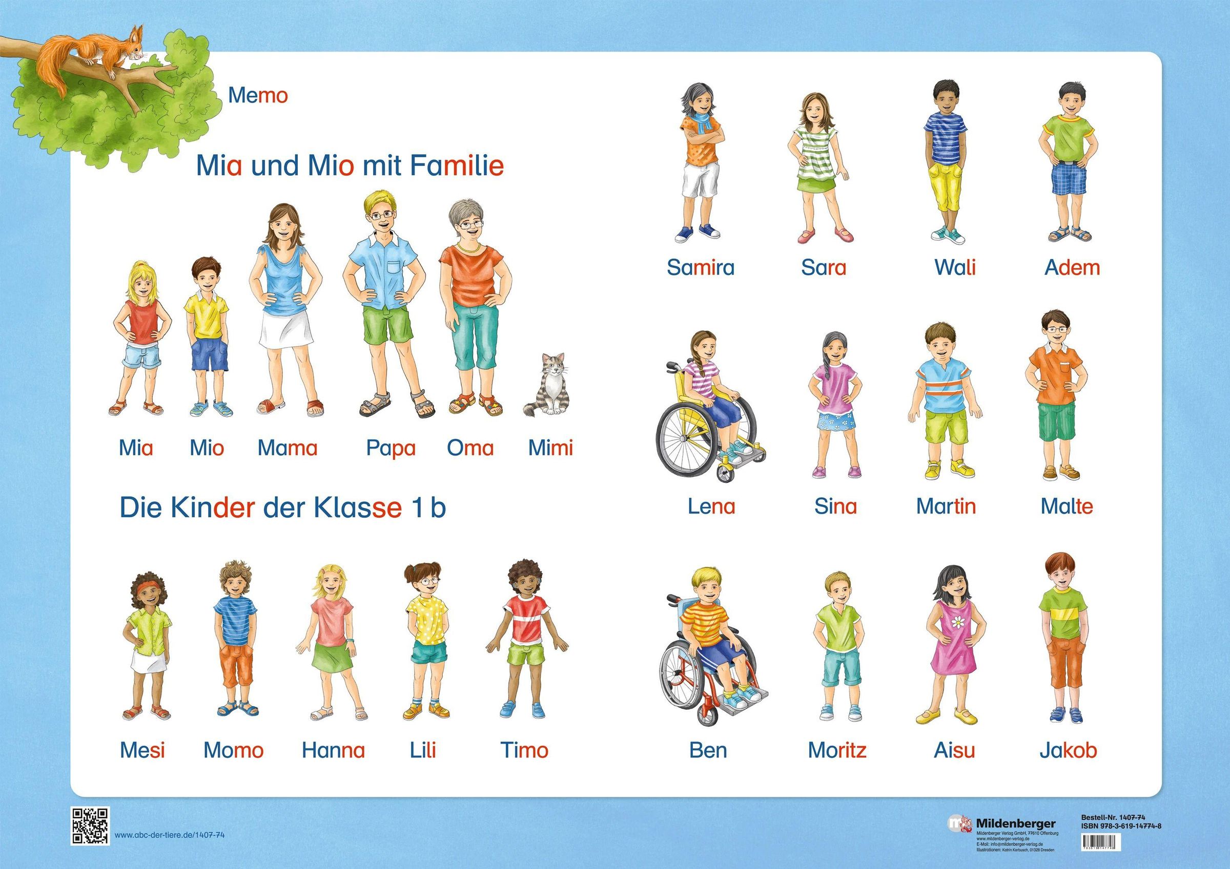 Das doppelseitige Poster zeigt die wichtigsten Charaktere aus dem "ABC der Tiere": Mia, Mio, ihre Familie mit Katze Mimi, die Kinder der Klasse 1b sowie das Eichhörnchen Memo. Es dient als dauerhafte visuelle Begleitung im Unterricht und hilft Kindern dabei, Namen und Aussehen der Figuren leichter zu verinnerlichen. Auch in den Geschichten "Neues aus Mildenberg" werden so alle leicht wiedererkannt.