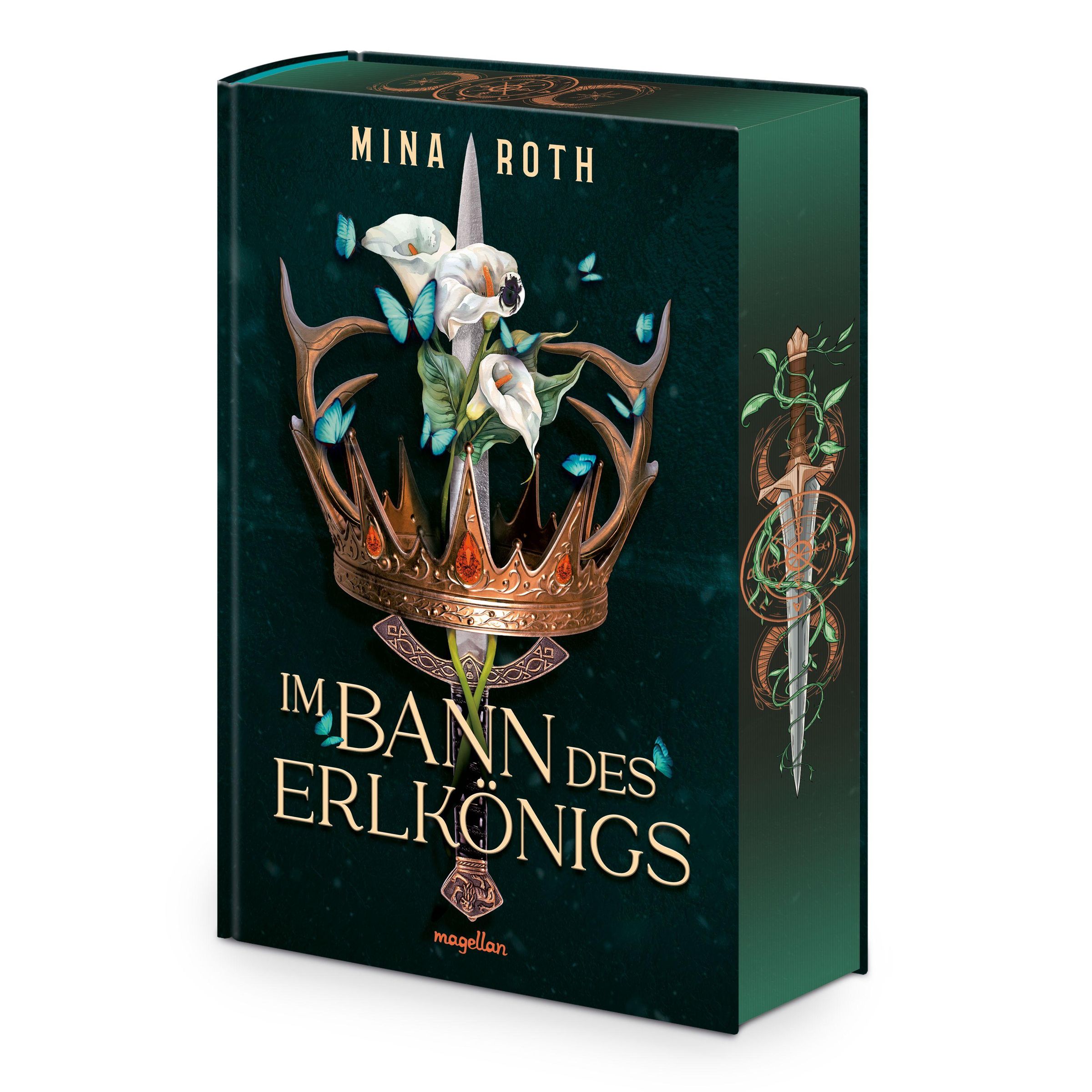 „IM BANN DES ERLKÖNIGS“ von Mina Roth. Eine Krone mit Blumen und blauen Schmetterlingen, Dolch an der Seite., Buch