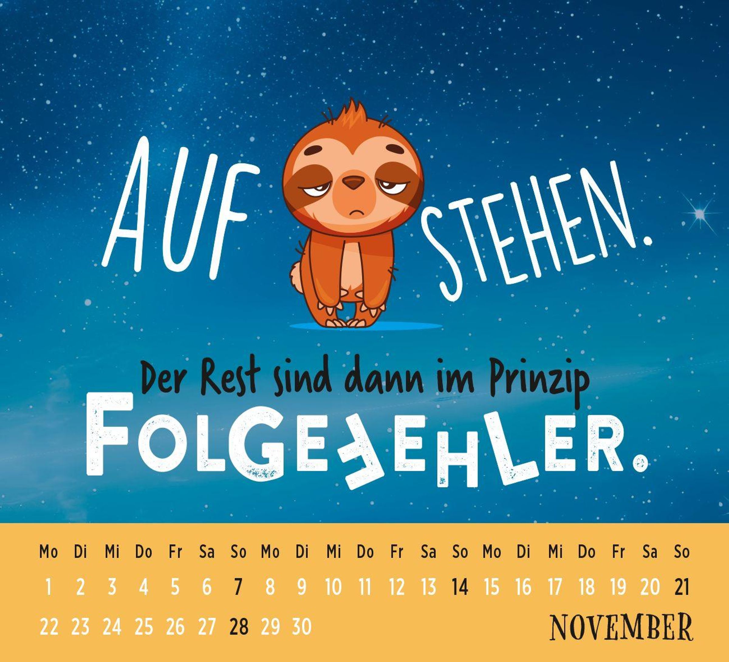 Dieser Mini-Kalender bringt Schwung in die Arbeitswoche. Denn jeder, der sich am Montag wieder voller Vorfreude in die Arbeit stürzt, weiß meist schon vor der Mittagspause: "Gegen nervige Menschen hilft ein Stressball. Man sollte aber gut zielen können." Dieser und andere lustige Sprüche erinnern mit einem Augenzwinkern daran, dass es neben der Arbeit viel Schönes zu erleben gibt. Mit seiner modernen und reduzierten Typooptik und dem frechen Inhalt ist er ein lustiges Geschenk für Frauen und Männer.