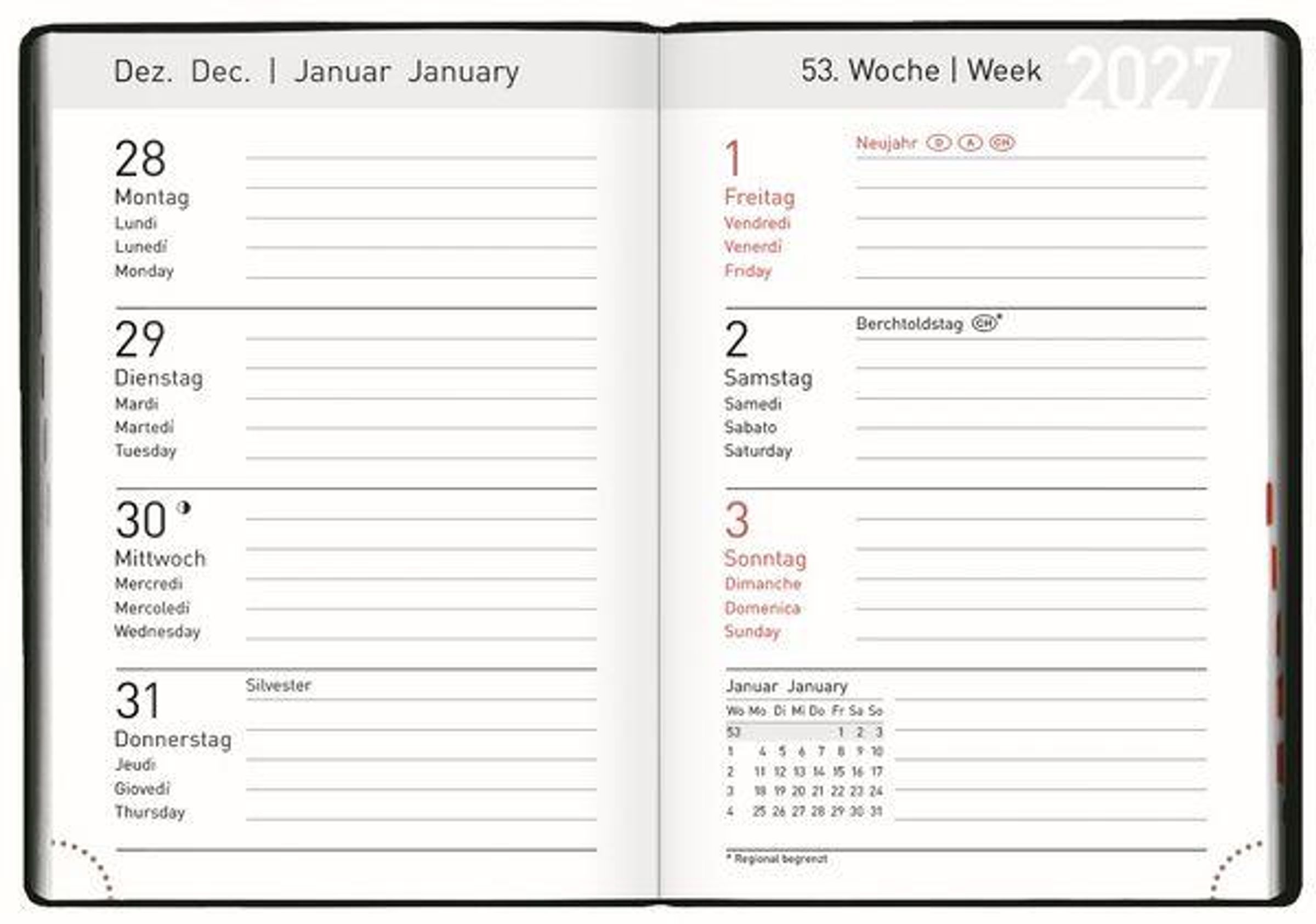 - Kalendarium auf Deutsch, Englisch, Französisch und Italienisch; Feiertage für Deutschland, Österreich und Schweiz