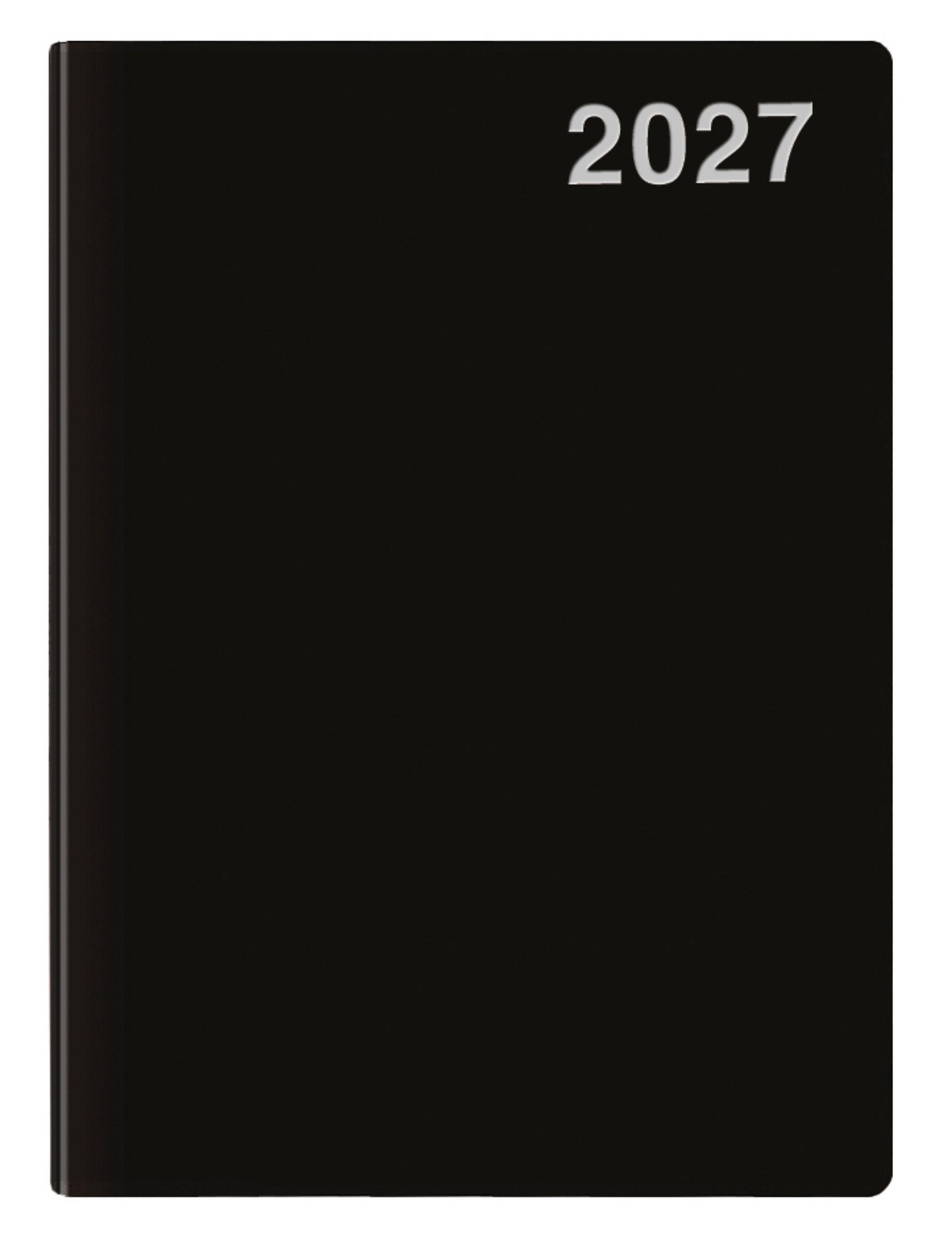 Kompakter Taschenkalender mit schwarzem Einband aus PVC. 168 Seiten, 2 Seiten pro Woche. Kalendarium d-e-f-i.