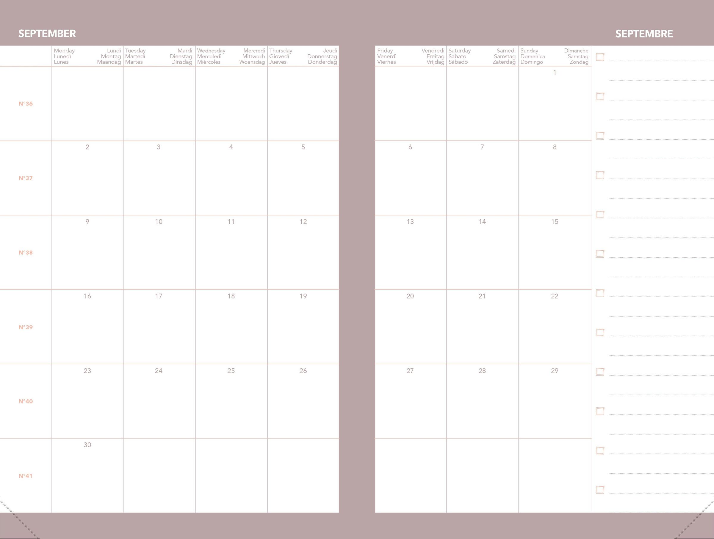 Farbiger Wochenkalender mit einer Woche auf 2 Seiten für eine gute Übersicht über die gesamte Woche. Enthält eine monatliche Doppelseite am Anfang jedes Monats, um einen Überblick über bevorstehende Ereignisse zu erhalten Weißes Clairefontaine-Papier, für ein einzigartiges Schreiberlebnis. Abtrennbare perforierte Ecken für eine schnelle und einfache Or ientierung. Abnehmbarer Einband und nachfüllbarer Innenteil für eine lange Nutzung. Aufbewahrungstaschen für kleine Dokumente und ein herausnehmbares Register für Ihre Kontakte.