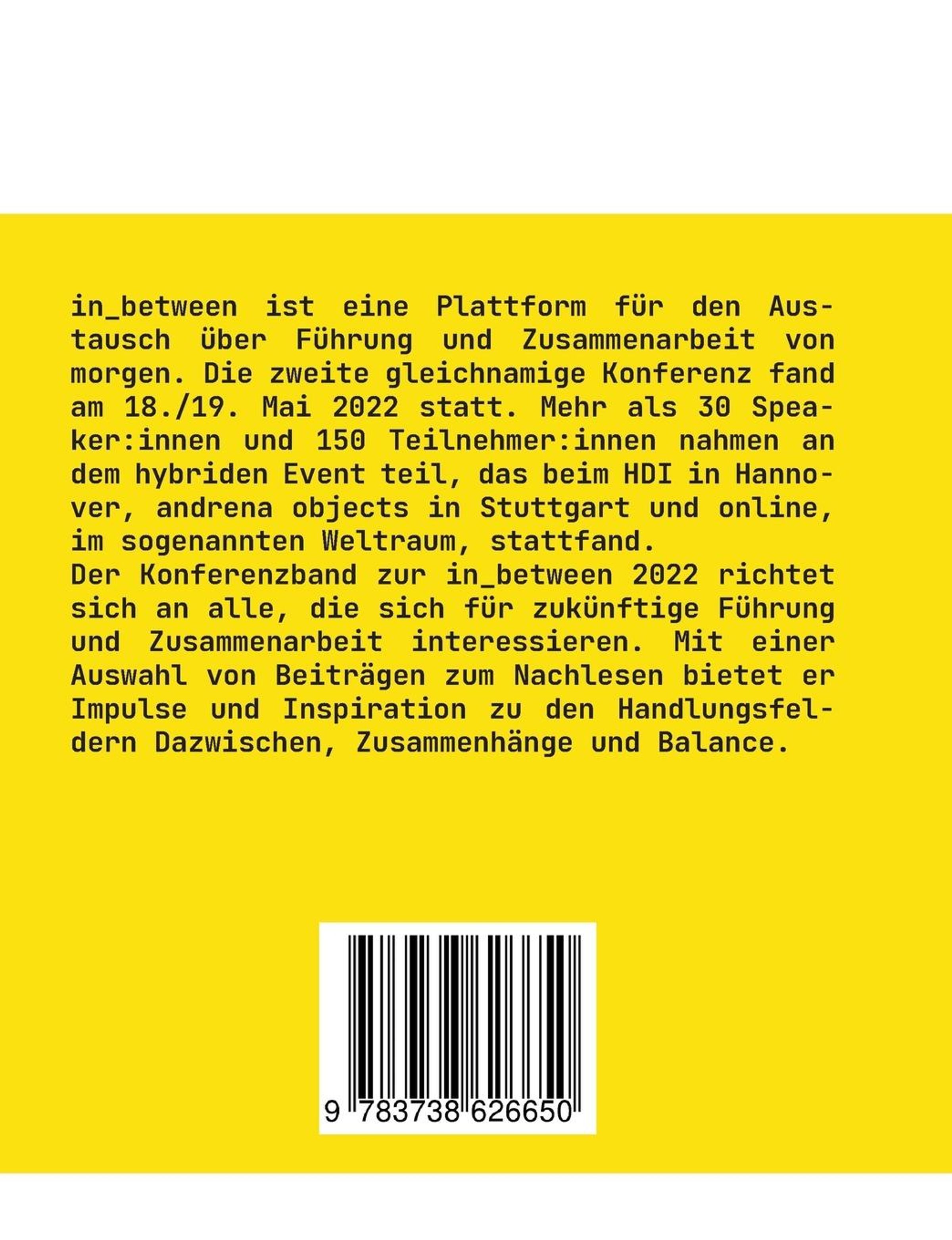 in_between ist eine Plattform für den Austausch über Führung und Zusammenarbeit von morgen. Die zweite gleichnamige Konferenz fand am 18./19. Mai 2022 statt. Mehr als 30 Speaker: innen und 150 Teilnehmer: innen nahmen an dem hybriden Event teil, das beim HDI in Hannover, andrena objects in Stuttgart und online, im sogenannten Weltraum, stattfand. Der Konferenzband zur in_between 2022 richtet sich an alle, die sich für zukünftige Führung und Zusammenarbeit interessieren. Mit einer Auswahl von Beiträgen zum Nachlesen bietet er Impulse und Inspiration zu den Handlungsfeldern Dazwischen, Zusammenhänge und Balance.