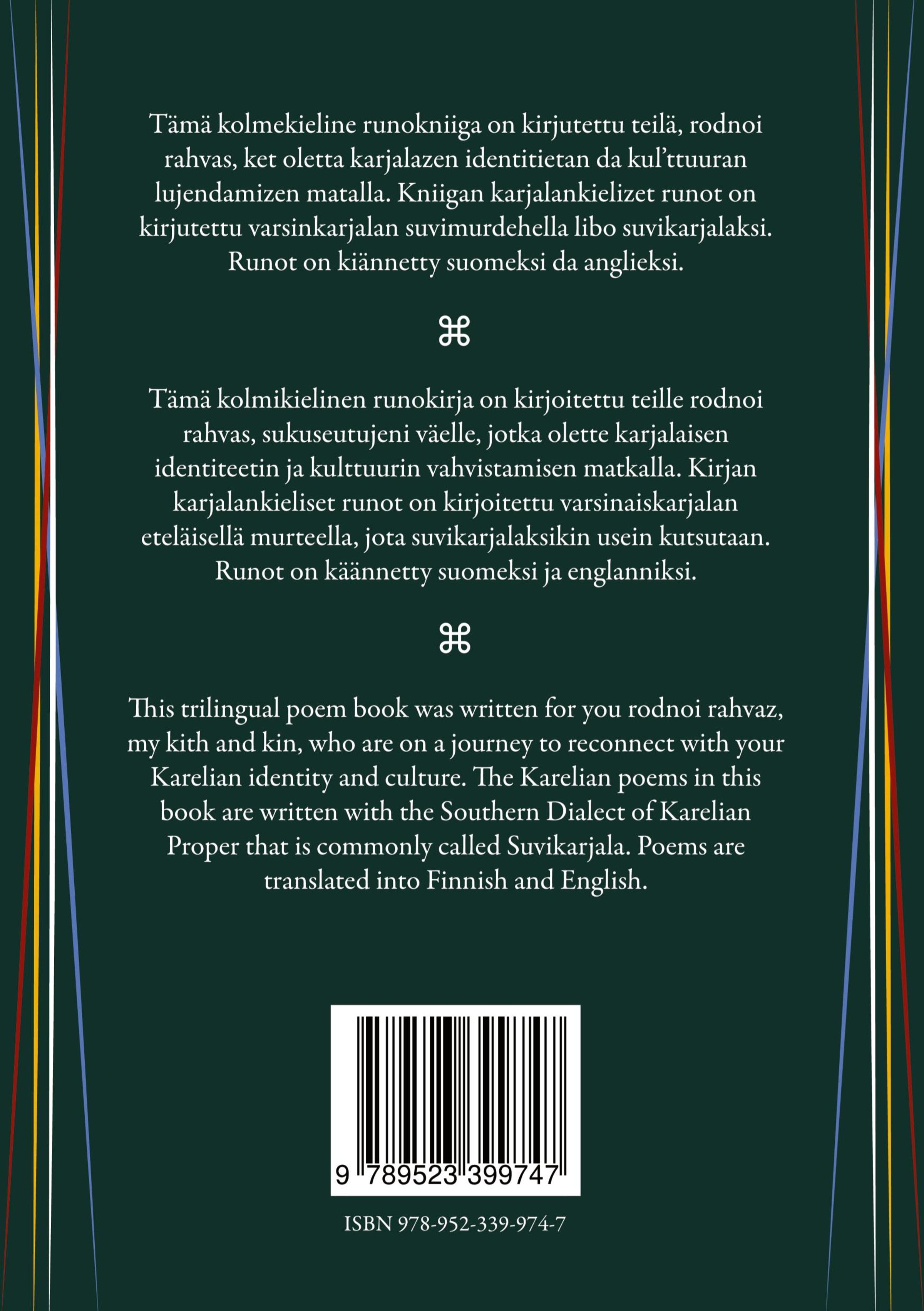 This trilingual poem book was written for you rodnoi rahvaz, my kith and kin, who are on a journey to reconnect with your Karelian identity and culture. The Karelian poems in this collection are written in the Southern Dialect of Karelian Proper, commonly called Suvikarjala. Each poem is translated into Finnish and English.