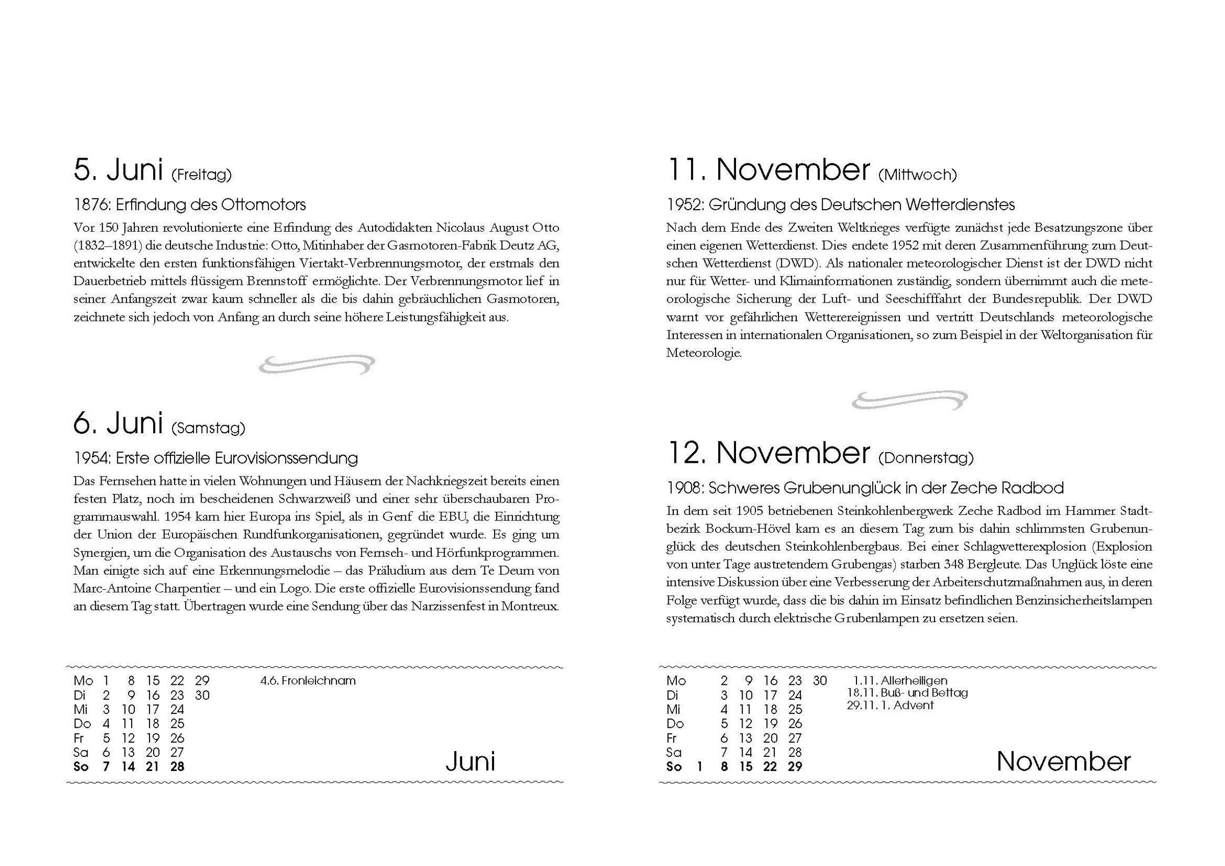 Dieser Kalender wirft einen Blick auf die wichtigsten Eckpfeiler deutscher Geschichte vom Mittelalter bis zur Gegenwart. An jedem Tag wird ein interessantes und manchmal auch bewegendes Ereignis aus der deutschen Geschichte vorgestellt. Ob Karl der Große, der erste Weltkrieg oder der Mauerfall, zu jedem Ereignis erfährt man die wichtigsten Hintergründe, Fakten und Daten.