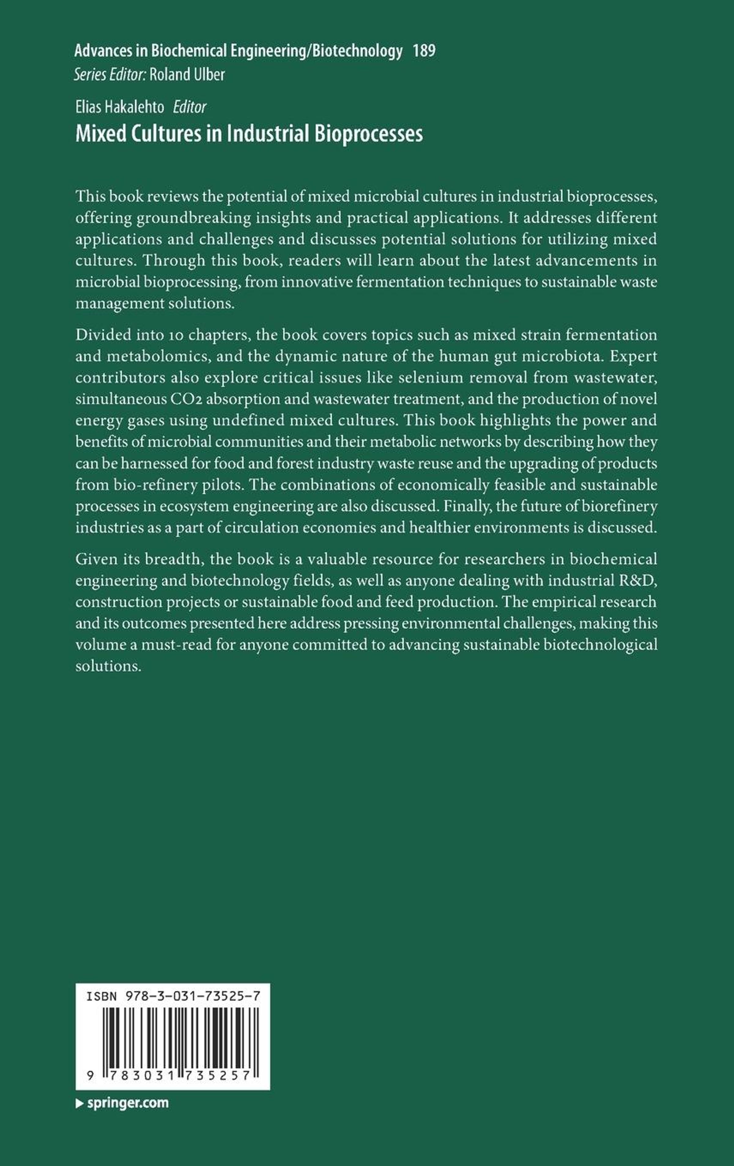 Divided into 10 chapters, the book covers topics such as mixed strain fermentation and metabolomics, and the dynamic nature of the human gut microbiota. Expert contributors also explore critical issues like selenium removal from wastewater, simultaneous CO2 absorption and wastewater treatment, and the production of novel energy gases using undefined mixed cultures. This book highlights the power and benefits of microbial communities and their metabolic networks by describing how they can be harnessed for food and forest industry waste reuse and the upgrading of products from bio-refinery pilots. The combinations of economically feasible and sustainable processes in ecosystem engineering are also discussed. Finally, the future of biorefinery industries as a part of circulation economies and healthier environments is discussed.