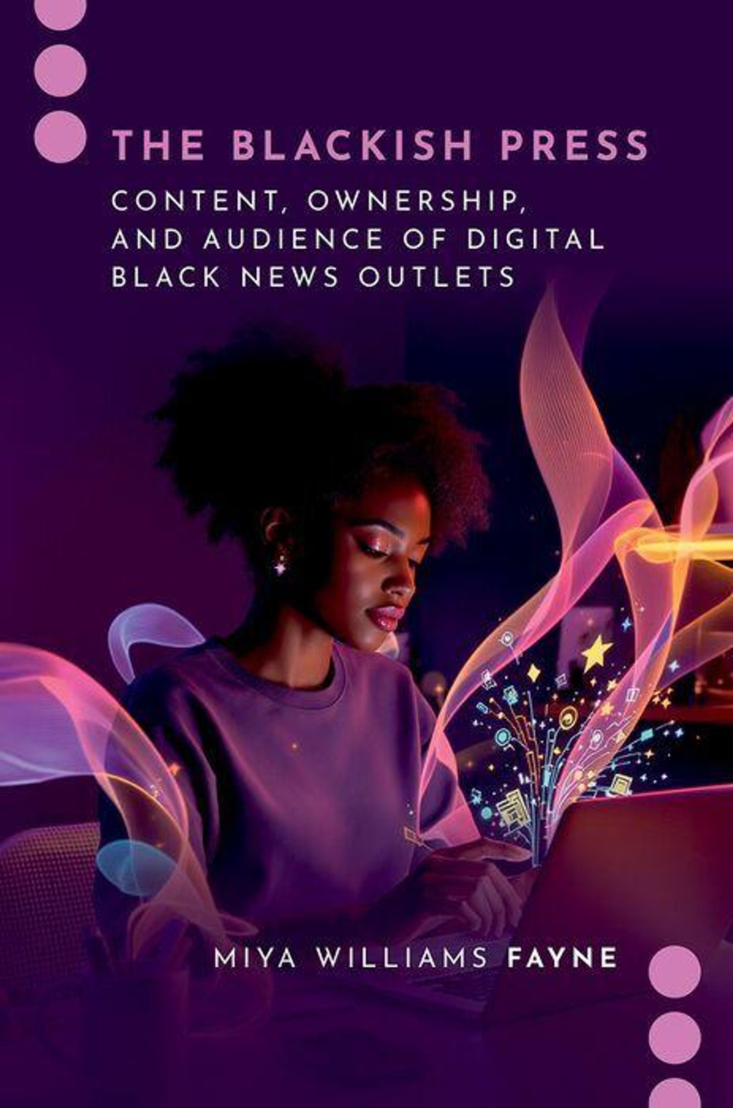 „THE BLACKISH PRESS. Content, Ownership, and Audience of Digital Black News Outlets. Miya Williams Fayne.“ Eine Frau mit Laptop, umgeben von farbigen Linien und Symbolen., Buch