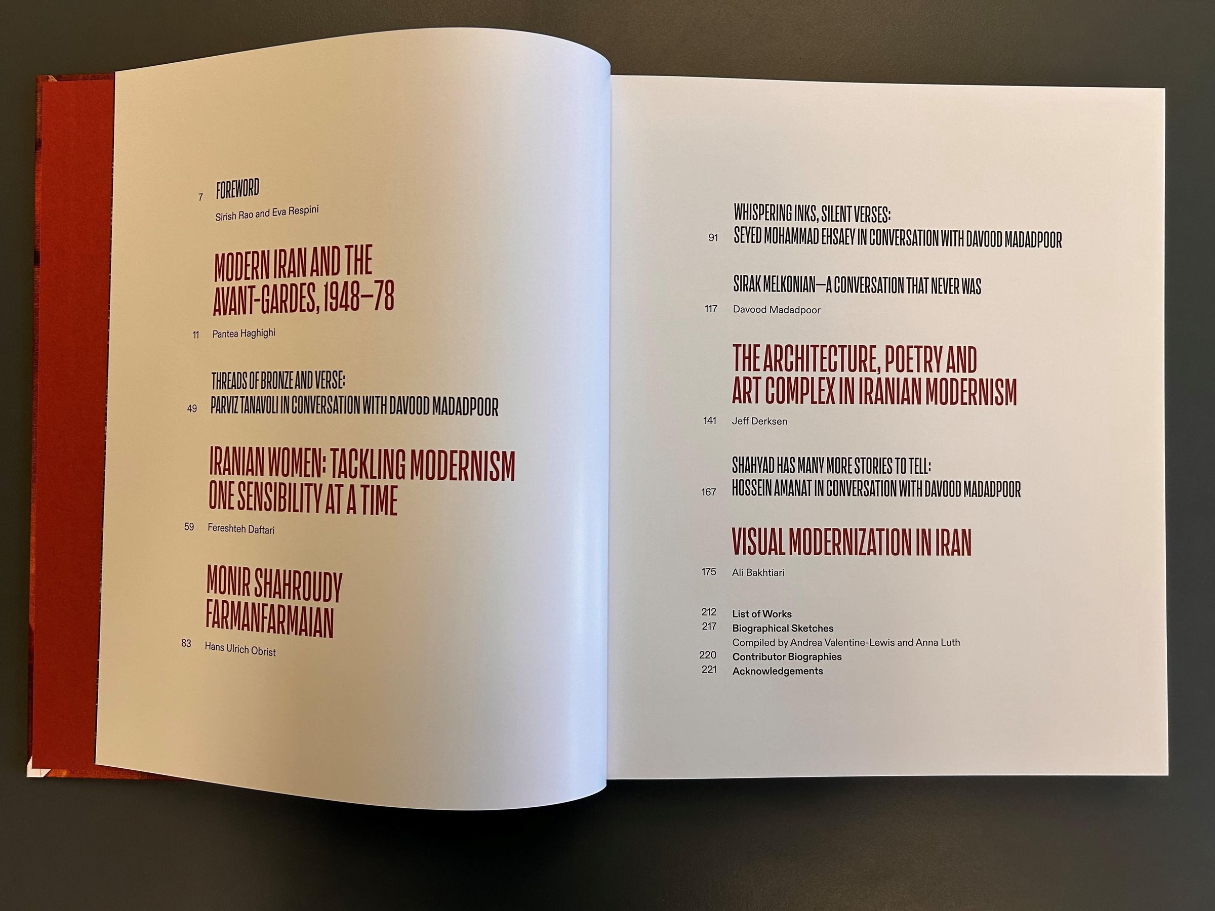 Die reich bebilderte Publikation stellt dreißig Künstler vor, die in der entscheidenden Zeitspanne (1948**--** 1978) tätig waren und in Medien wie Malerei, Skulptur, Druckgrafik, Zeichnung und Architektur arbeiteten. Die Publikation bieten einen Überblick über die Bandbreite künstlerischer und politischer Einflüsse auf die Entstehung der iranischen Moderne. Mit den weiteren Beiträgen von Autoren wie Fereshteh Daftari, Davood Madadpoor, Hans Ulrich Obrist und Ali Bakhtiari stellt der Band eine aktuelle Ergänzung zur Forschung eines alternative Modernismus als auch über die Geschichte der iranischen Kunst dar.
