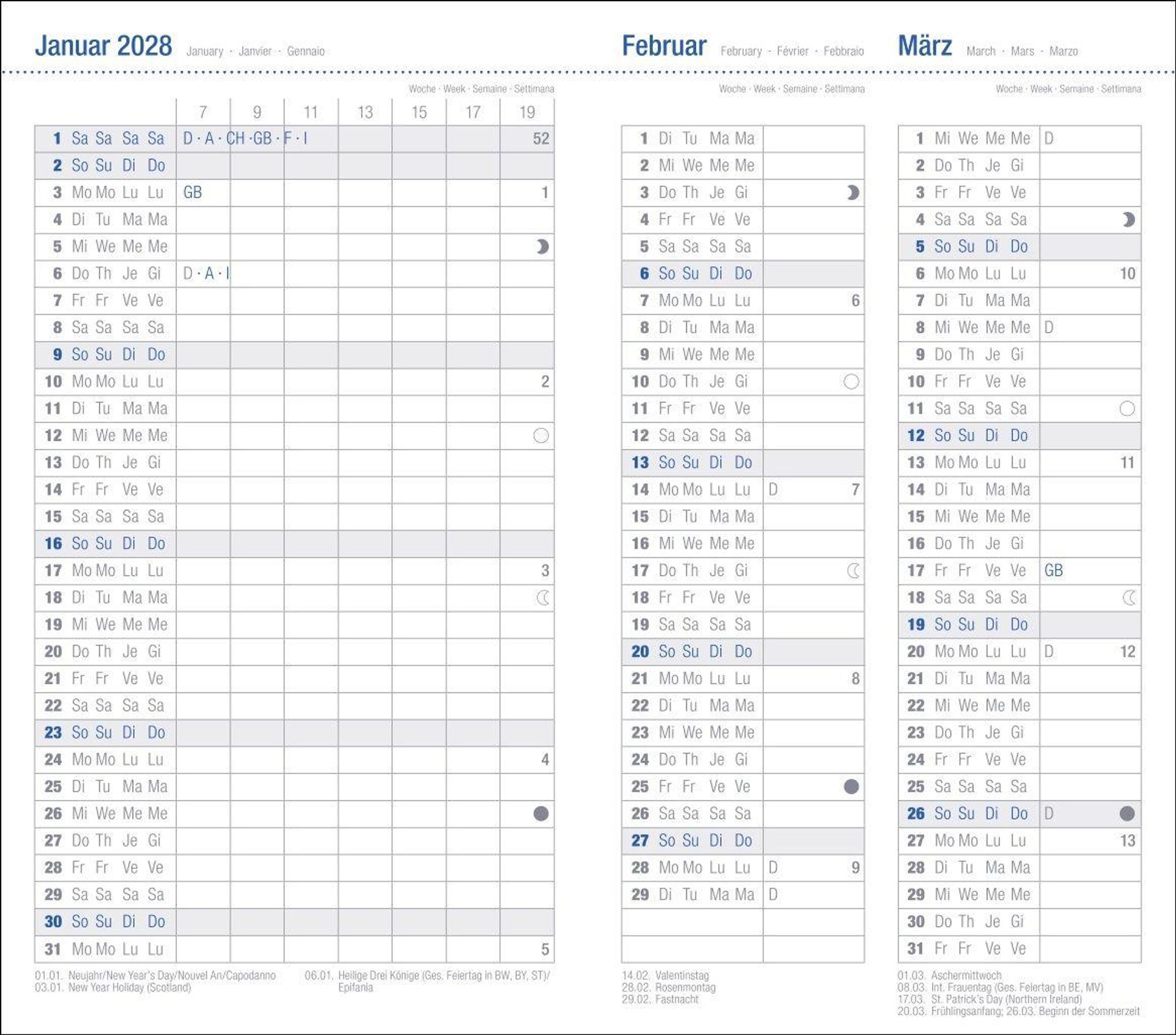 Der kleine Schwarze für die Handtasche: Praktische Organisationshilfe mit viersprachigem Kalendarium und 3-Monatsvorschau auf 2028