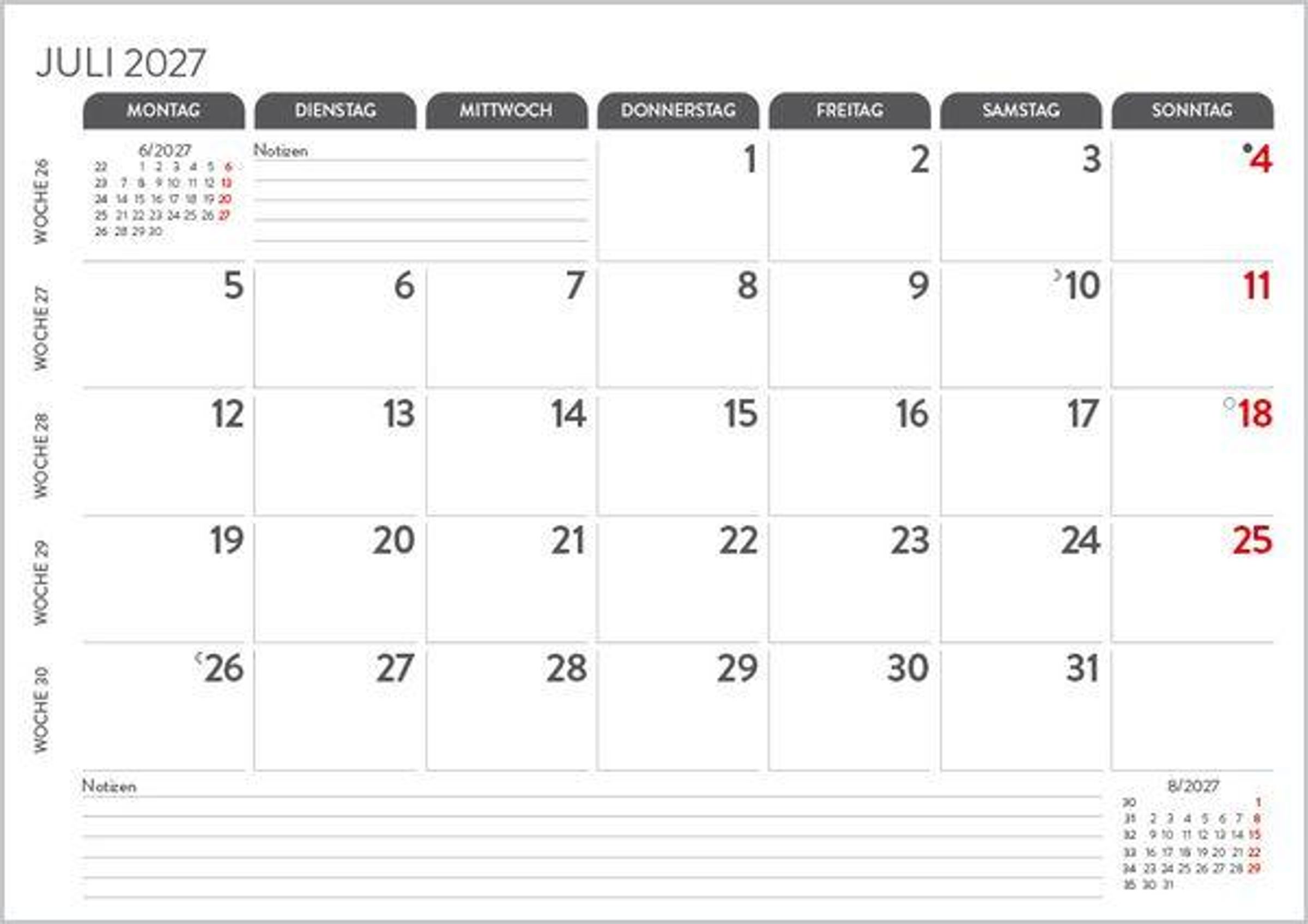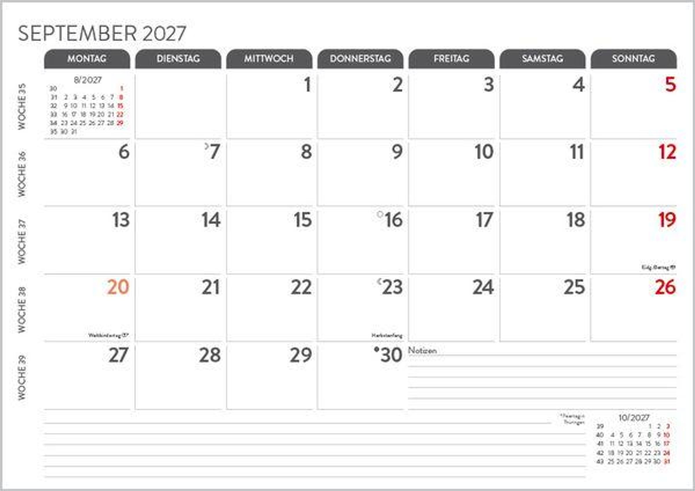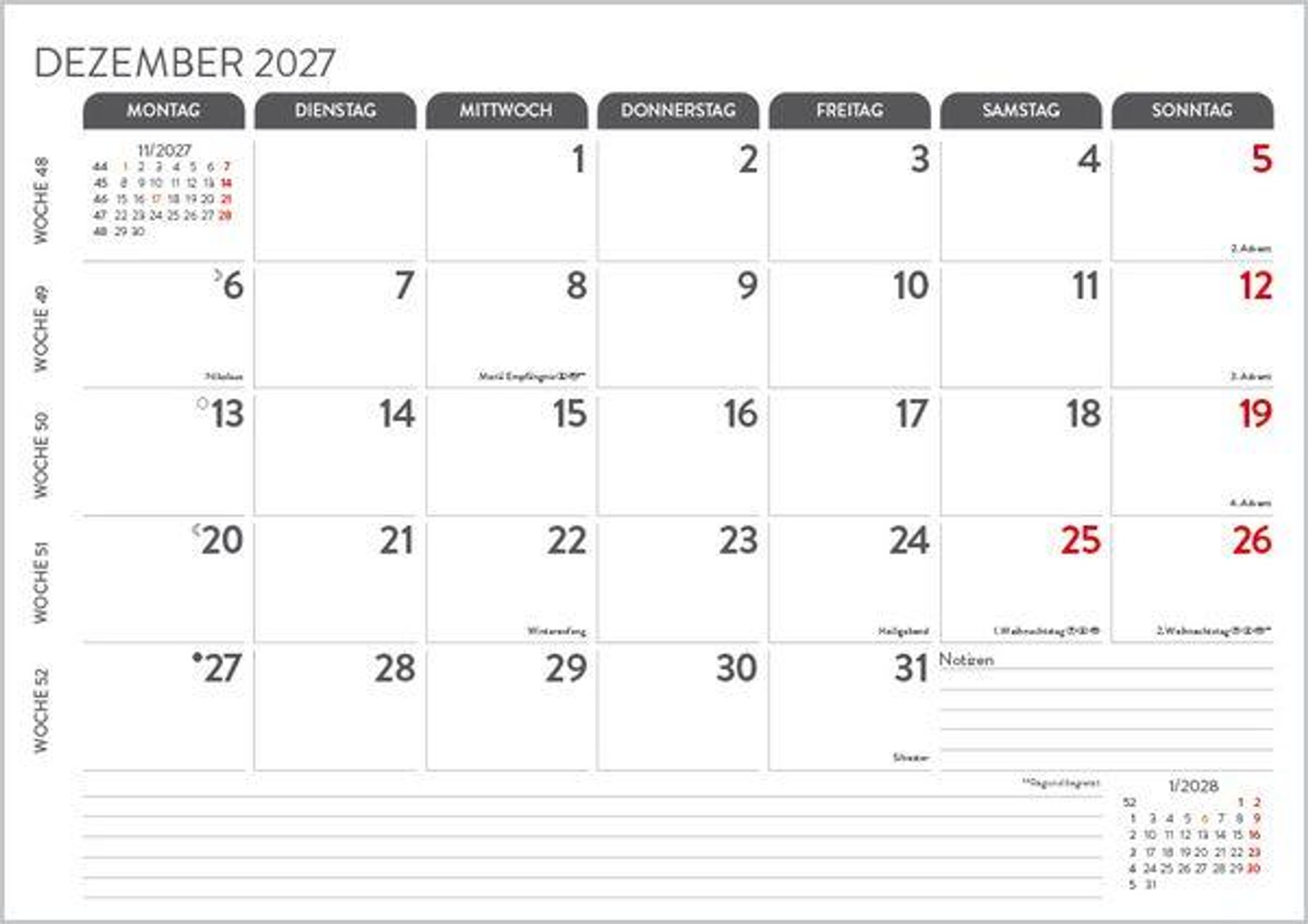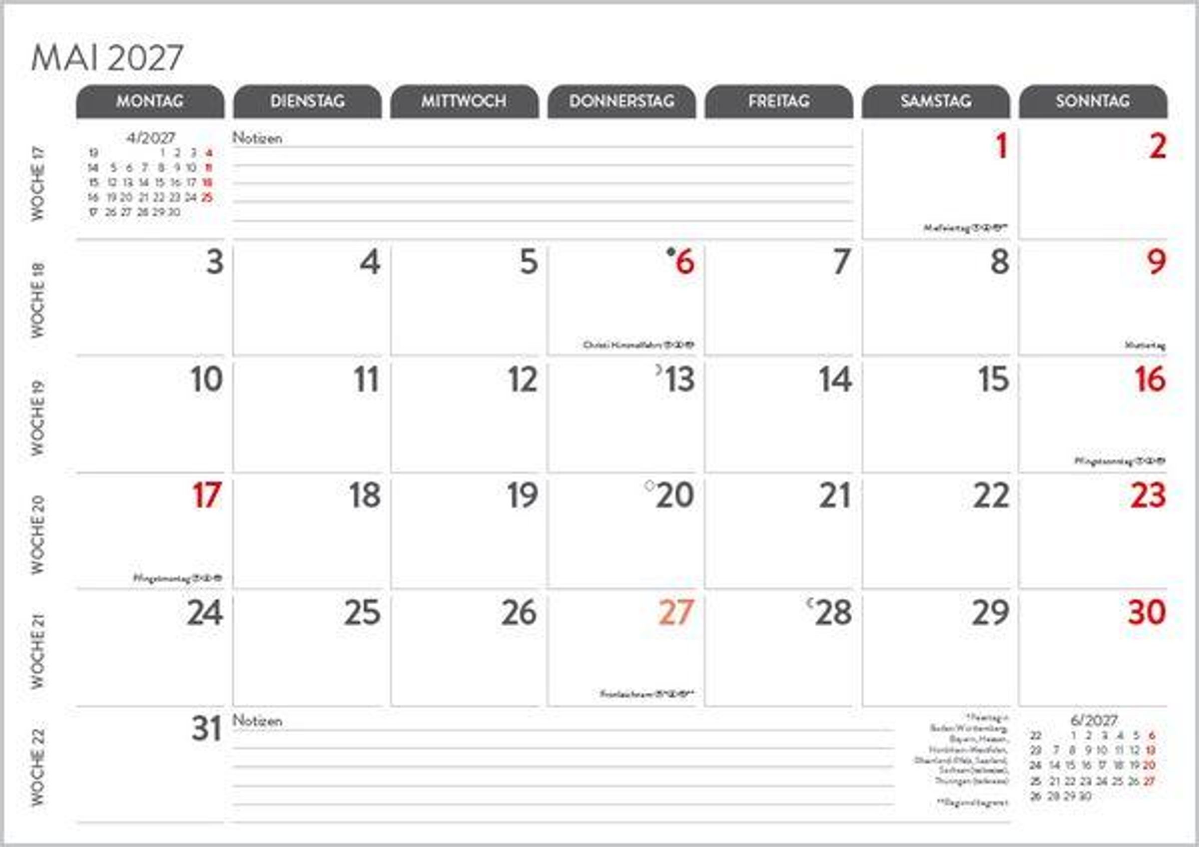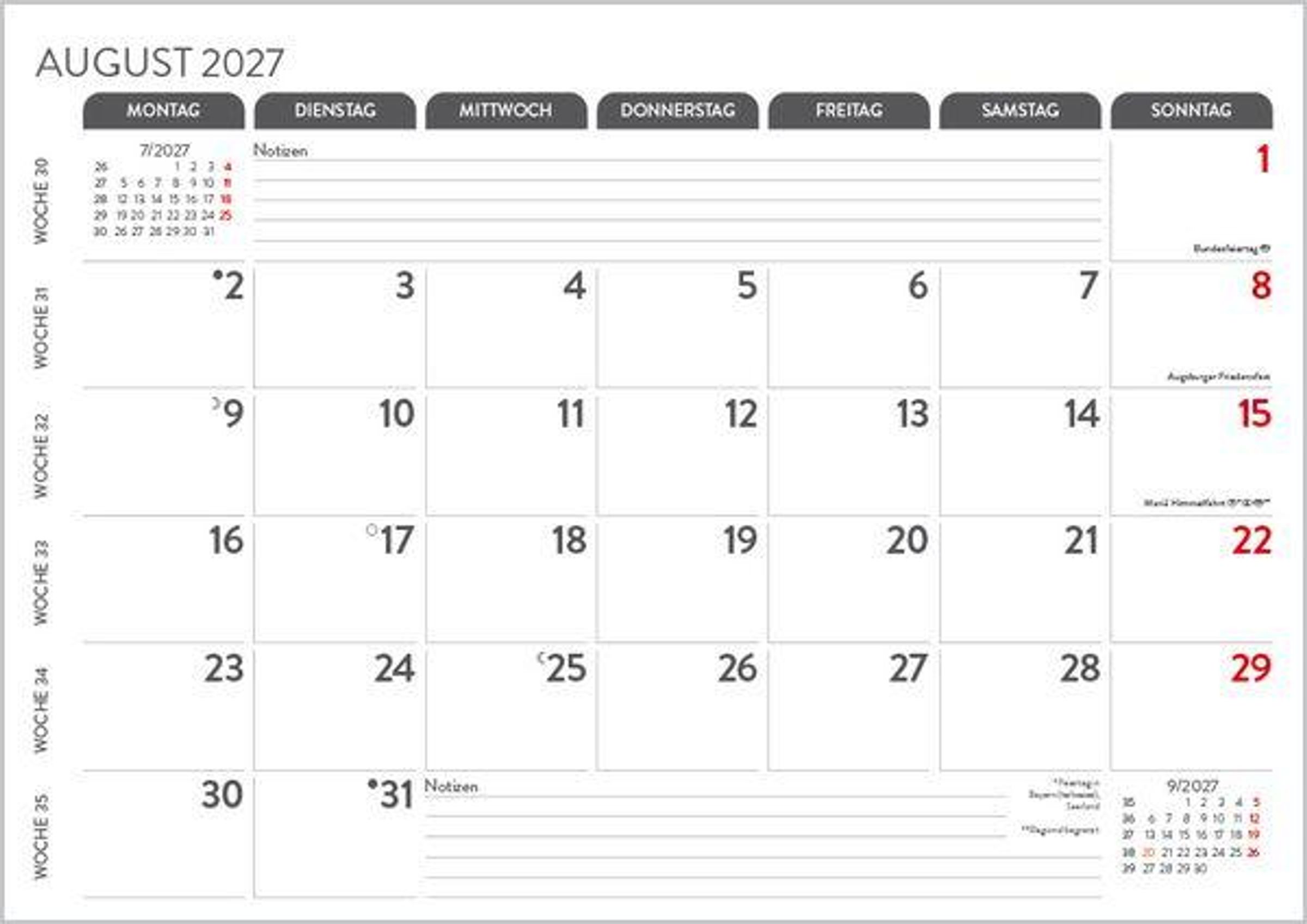 - Kalendarium auf Deutsch mit hervorgehobenen Sonn- und Feiertagen für D, A und CH