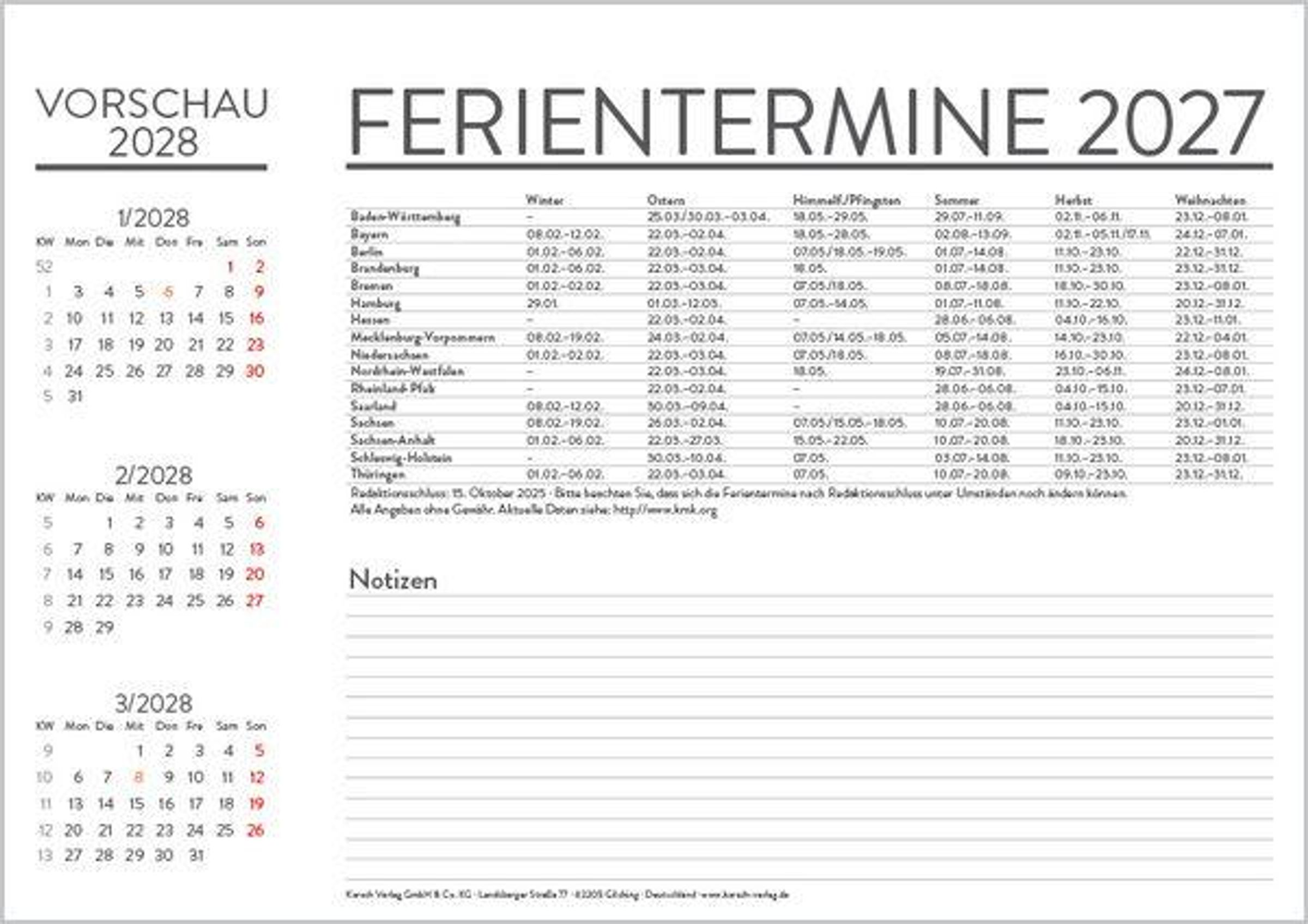- 12 Monate mit Ferienterminen und Feiertagen. 29,7 x 21 cm.