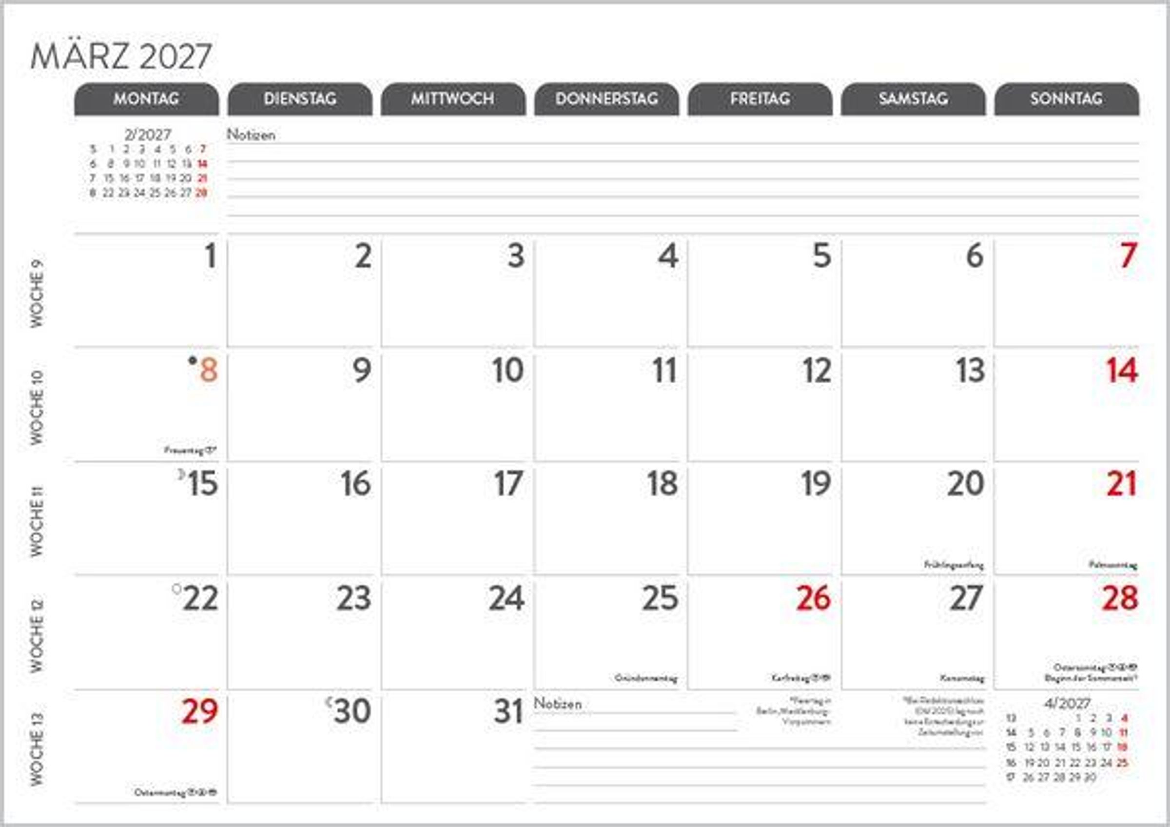 Praktischer Wandplaner im zweifarbigen Design mit viel Platz zum Eintragen. Inklusive Ferienterminen und Vorschau bis März des Folgejahres. Kalendarium in Deutsch.