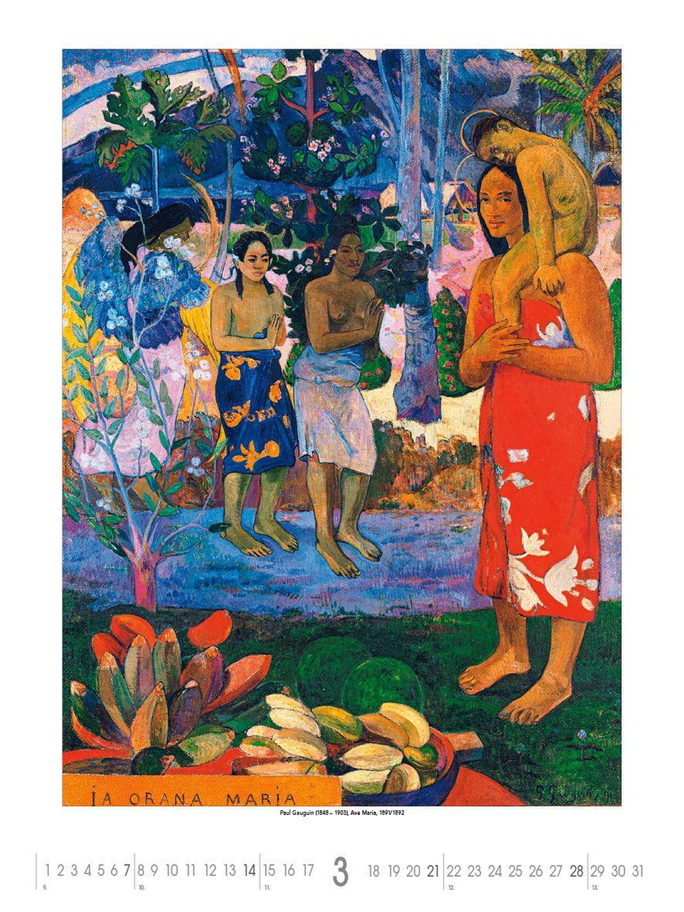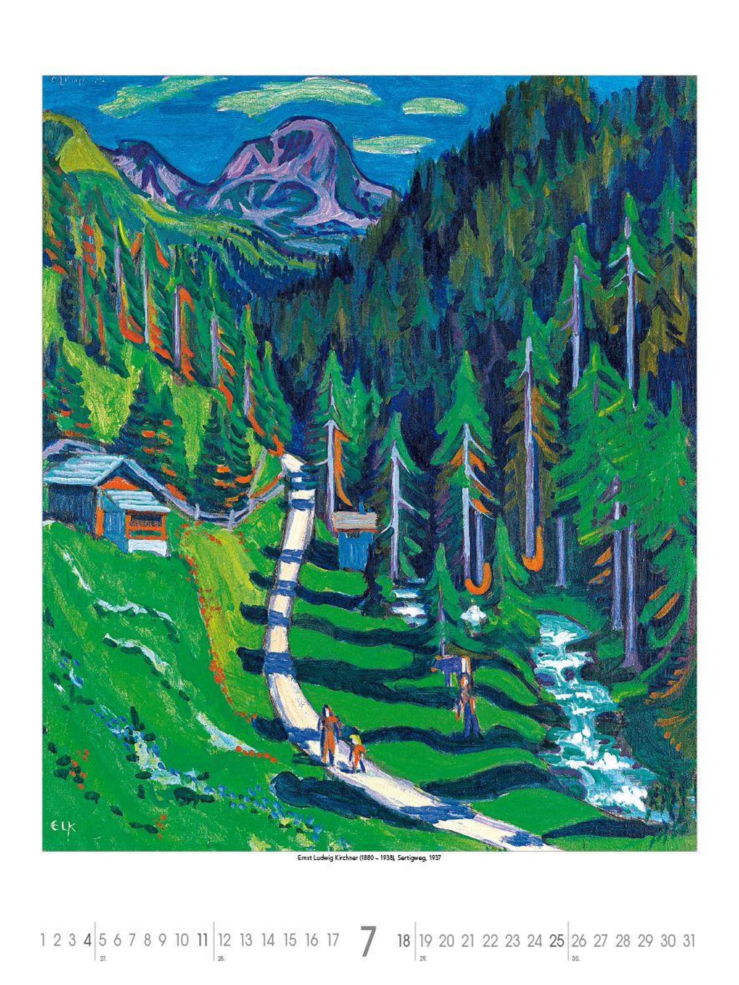 Text: "Monet bis Klee", Liste von Künstlernamen, Jahr 2027. Oben Gemälde von Natur und Figuren in lebhaften Farben., Kalender