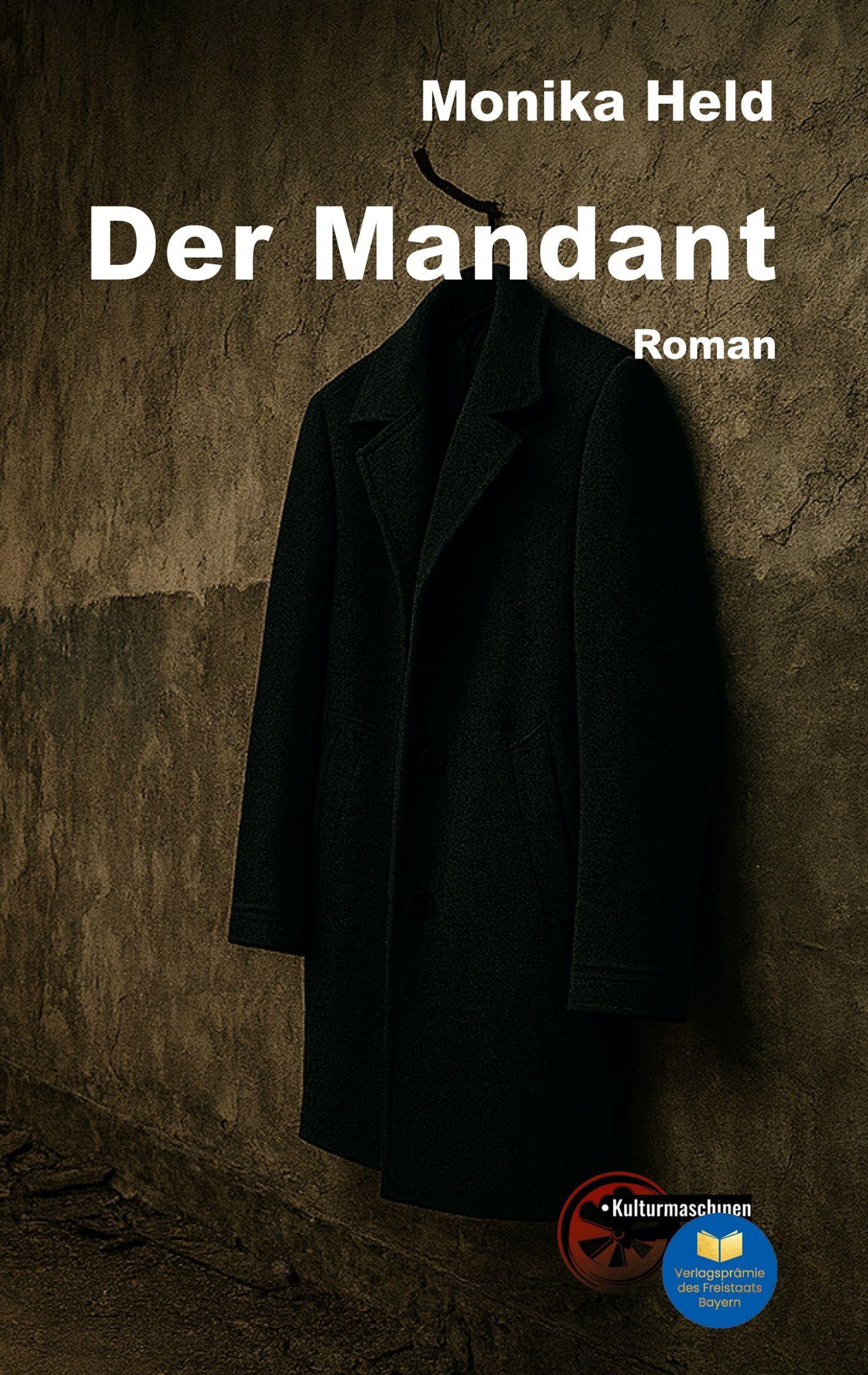 "Monika Held. Der Mandant. Roman. Ein schwarzer Mantel hängt an einer strukturierten Wand. Kultursiegel.", Buch